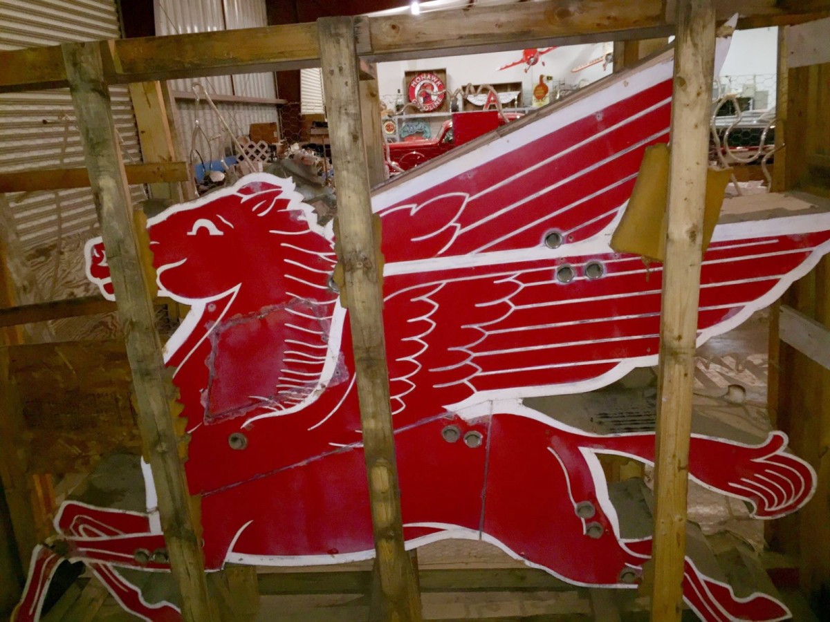 It’s probably safe to say that the vast majority of car guys and gals know this logo. Mobil has an incredibly interesting history and anyone with deep, deep, deeeeeeeeep pockets can snag this rotating Mobil Pegasus neon sign which is listed on eBay with a buy it now price of (are you sitting down?).. $74,995! I know, change back from your $75,000 bill, if they made such a thing as a $75,000 bill. It’s located in Fresno, California, let’s check it out.