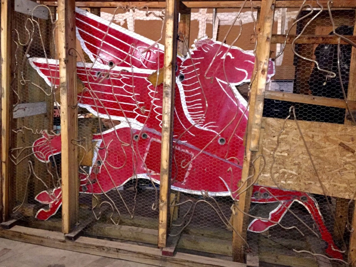 I get the nostalgia here and the fact that this sign is still in the crate with its neon tubes. But the asking price is down right silly. That’s a lot of money for 20′ of sheet metal some glass tubes and an electric motor. If you had two Pegasus signs in good shape you could make your own neon rotator for a fraction of the price, and when mounted on a pole no one would know the difference. Most would not know the difference. Most younger people don’t even know what the significance of this sign is anyway. I wouldn’t pay more then $3k for this but that’s just me. If a I want a Pegasus I’d just make one. JMHO.