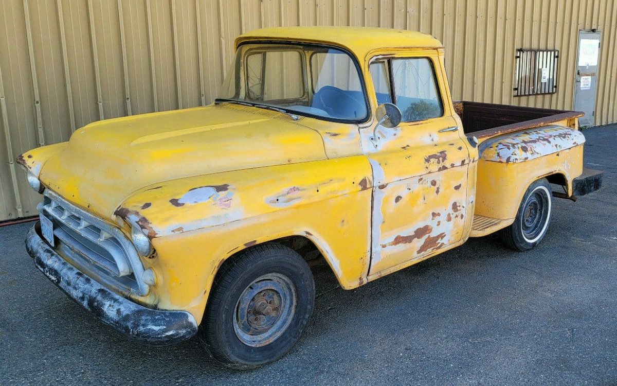 Before pickup trucks had features like massaging seats and controls for the brightness and color of your ambient lighting, trucks were necessary tools built to do real work, harder chores than hauling a few bags of mulch or some Golden Retrievers. This 1957 Chevrolet pickup in Sacramento, California proved tough enough to survive more than 60 years with no pampering or hot-rodding and comes to market here on eBay as an honest never fiddled-with work truck. Though not running, the inline-six turns by hand, and a host of undercarriage pictures show a decent candidate for restoration or more decades of service. Bidding has surpassed $7500 with more than 15 suitors showing interest.