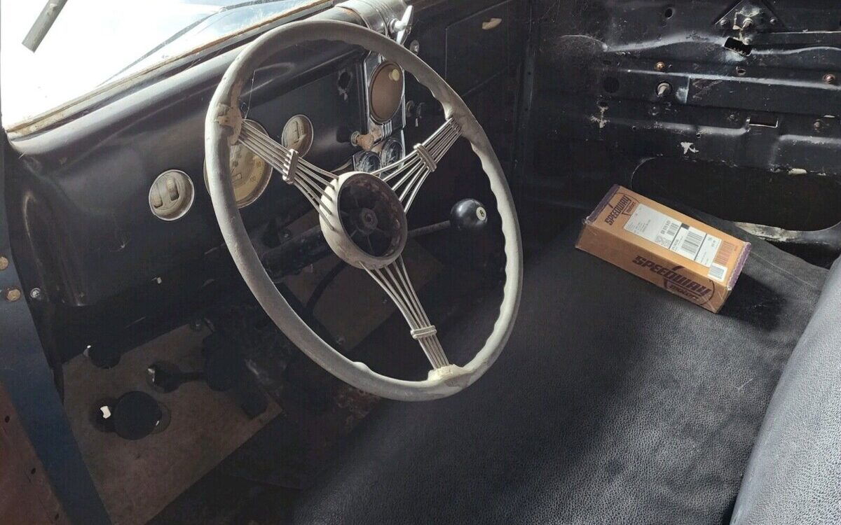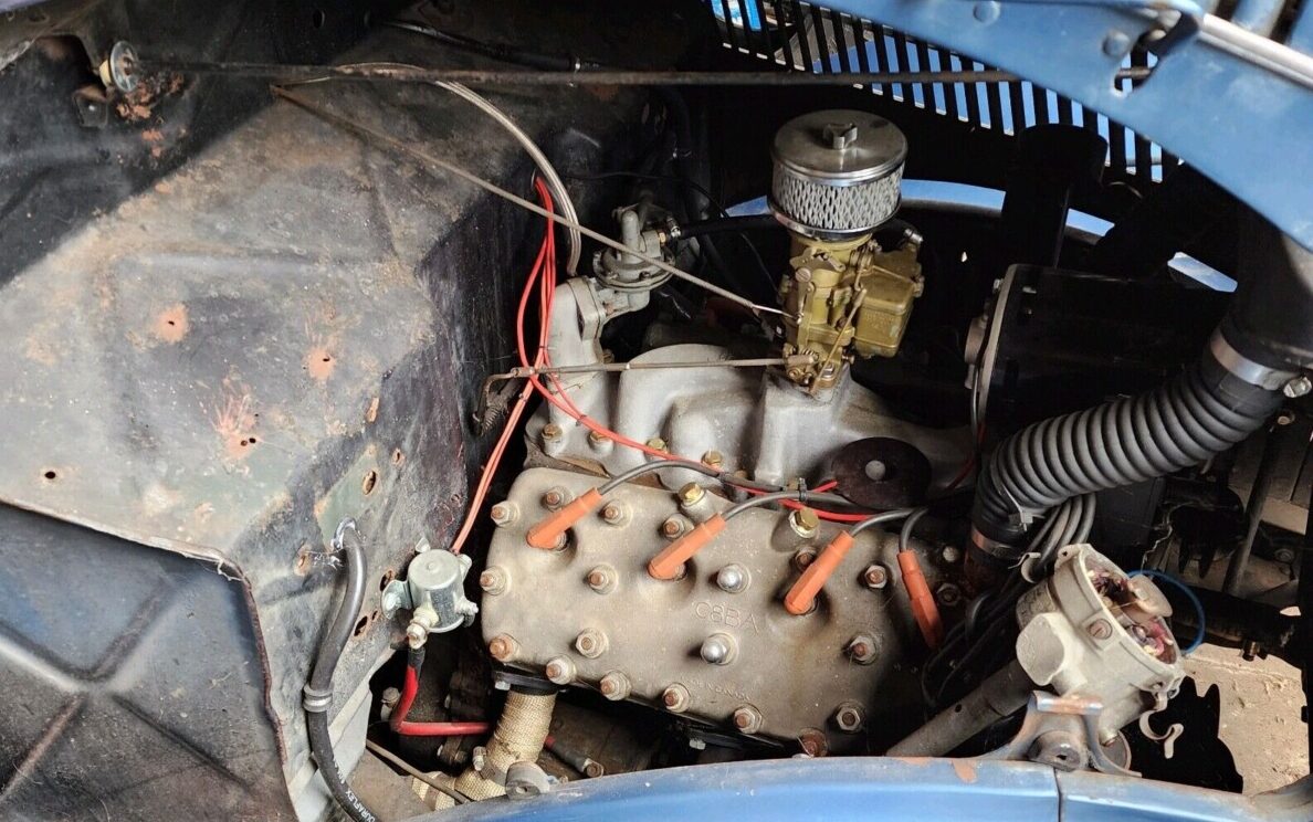 Here’s a refreshing item for all of you Ford fans, this Coupe is still sporting its 221 CI flathead V8 – no stinkin’ Chevy needed here! The listing is confusing though as it states, “Rebuild Mere Flathead bigger version > 60hp“. Huh? The original was good for 85 HP so are we being told that due to various improvements, it’s now 60 more? Search me fish, an inquiry will need to be made. What would give it another 60 HP? The seller adds, “Headers and new exhaust, Dual point distributor ( not working ), new potronics (sic), not installed but included with sale” Nope, that doesn’t add up, and to add insult to injury, this one’s a non-runner. The original three-speed manual transmission is still in place, the brakes are from some version of a ’40 Ford, and jolt-wise, we’ve got twelve volts via an alternator conversion.