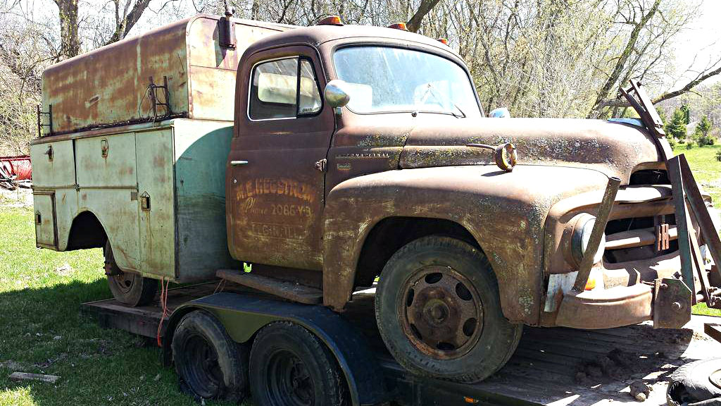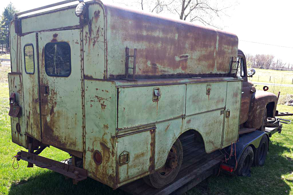 It appears by the tow bar, this truck was pulled to a job site as an equipment trailer, long after it quit running.
