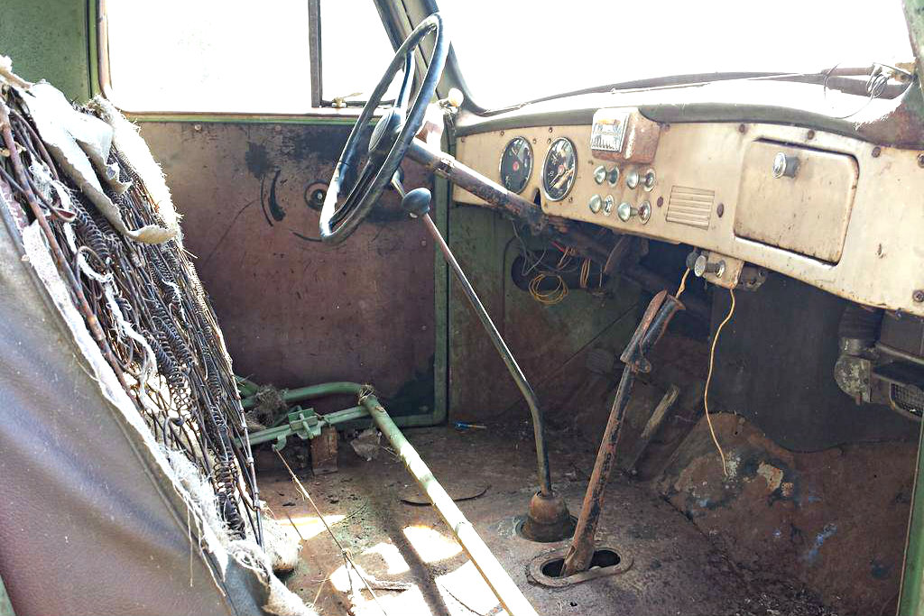Inside you will find a simple interior with its bench seat bottom flipped up. The driver door latch or window crank is missing or possibly broken off, but the rest of the interior seems fine. There is no evidence of rot, but the curled up wires under the dash are interesting. Little information is given about the drive train other than it being in place, and that the transmission shifts.