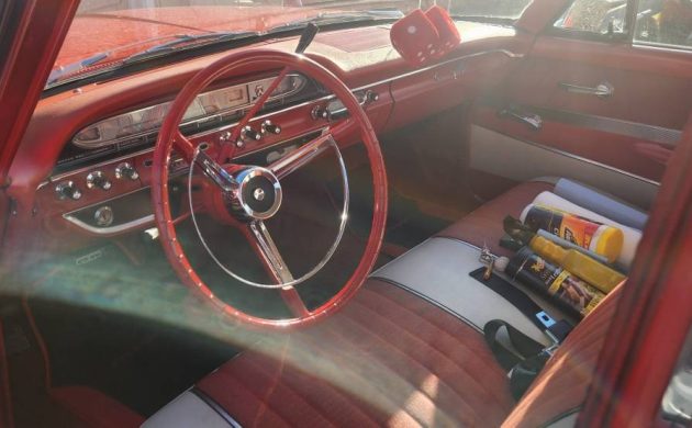 Chevrolet continued to beat out Ford for the top sales spot. But the Dearborn company still built nearly three-quarters of a million full-size automobiles in ‘61. 40% of sales were for cars badged as Galaxies, and 142,000 of those were 4-door sedans like this super sweet white-over-red example. We’re told the mileage is 81,000 and the car was treated to a restoration back in the 1980s. So, it has held up well for the last 40 years.