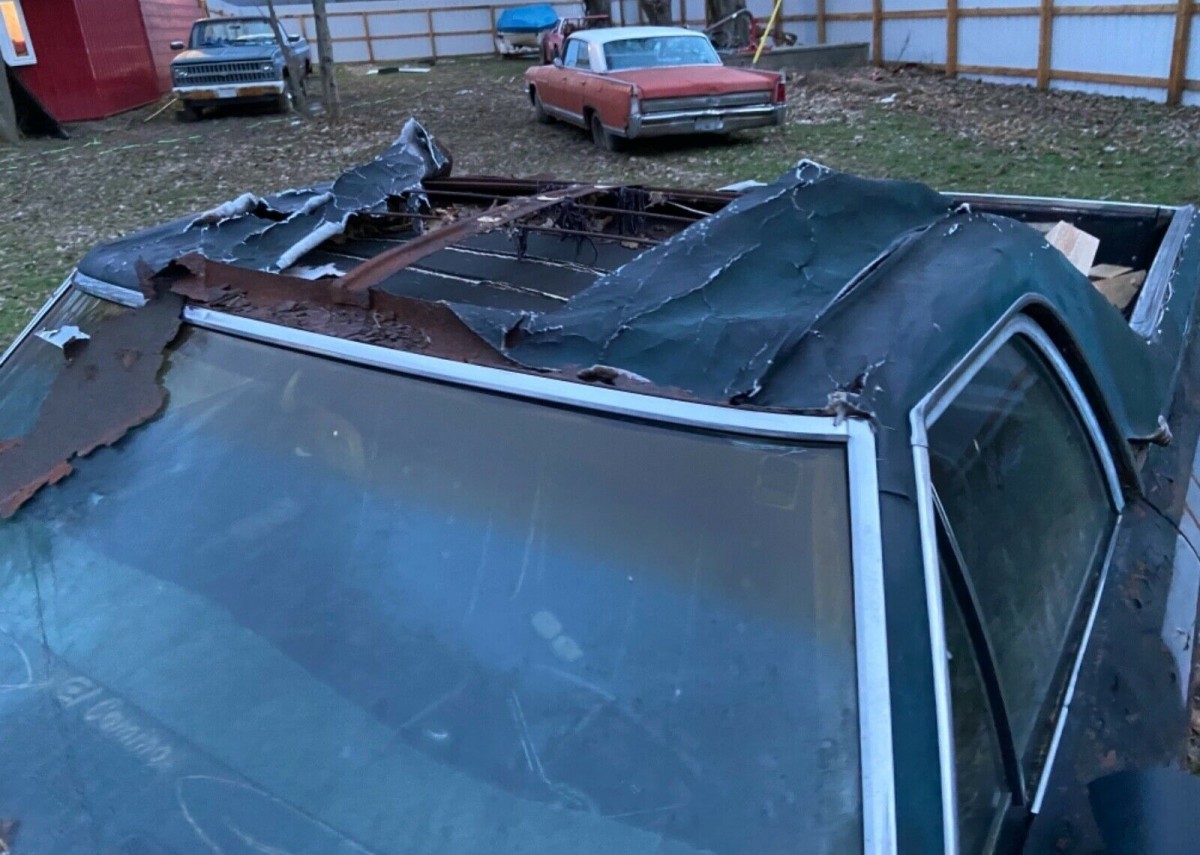 With its flat tires, this ’68 El Camino has been serving as lawn art and a place to store firewood (which will be removed when the pickup is taken away). This is not the only vehicle that seems to be slowly deteriorating in that yard; its company at a minimum looks like a 1953-54 Plymouth, 1971-72 Pontiac Ventura, mid-70s full-size Buick, 1964 Buick Electra 225, and a couple of Chevy work trucks. The body may or may not be holding up depending on where you look, but the roof is a big problem. The vinyl top is gone and what was under it has rotted – badly.