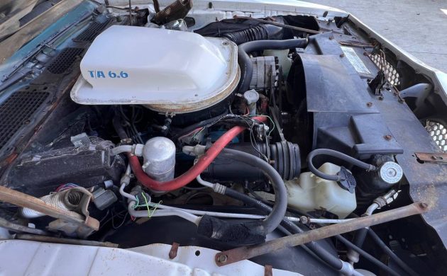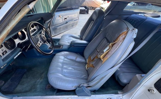 As can be seen, the interior is light blue and the driver seat is torn and damaged. The carpet is stained but it looks like everything is intact. This Trans Am left the factory with air conditioning, tilt steering, deluxe interior and T-Tops as options. The deluxe interior included upgraded seats and door panels. The car sends its power to the rear wheels via a GM Turbo 350 automatic transmission.