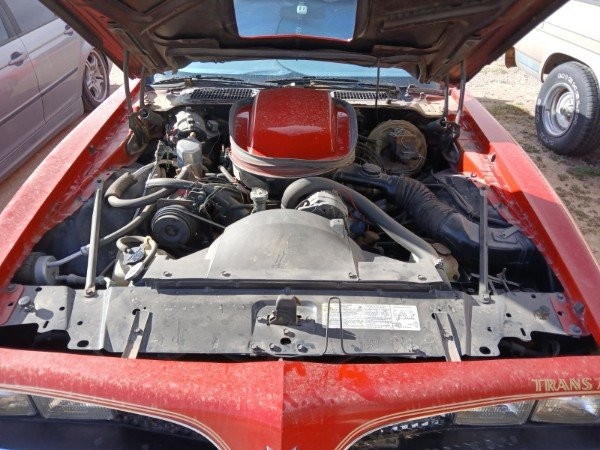 The Trans Am is a little dirty in this picture of the engine compartment. If you have ever been to Odessa, the wind and dust is a constant most of the time and it is hard to keep a car clean in such an environment. The standard engine for the Trans Am in 1977 was the L78 400 cubic inch V8, rated at 180 horsepower. Pontiac introduced the W72 400 cubic inch engine option as the high-performance engine after the demise of the Pontiac 455. The performance engine option, the W72 400 cubic inch V8, was rated at 200 horsepower. The W72 engine featured chrome valve covers and 6X heads from the factory. In California, emissions regulations limited the Trans Am to only the Oldsmobile 403 cubic inch V8 engine, rated at 185 horsepower. Demand for the Grand Prix and Firebird were so great in 1977 that the company used Chevrolet and Oldsmobile engines to fill orders.