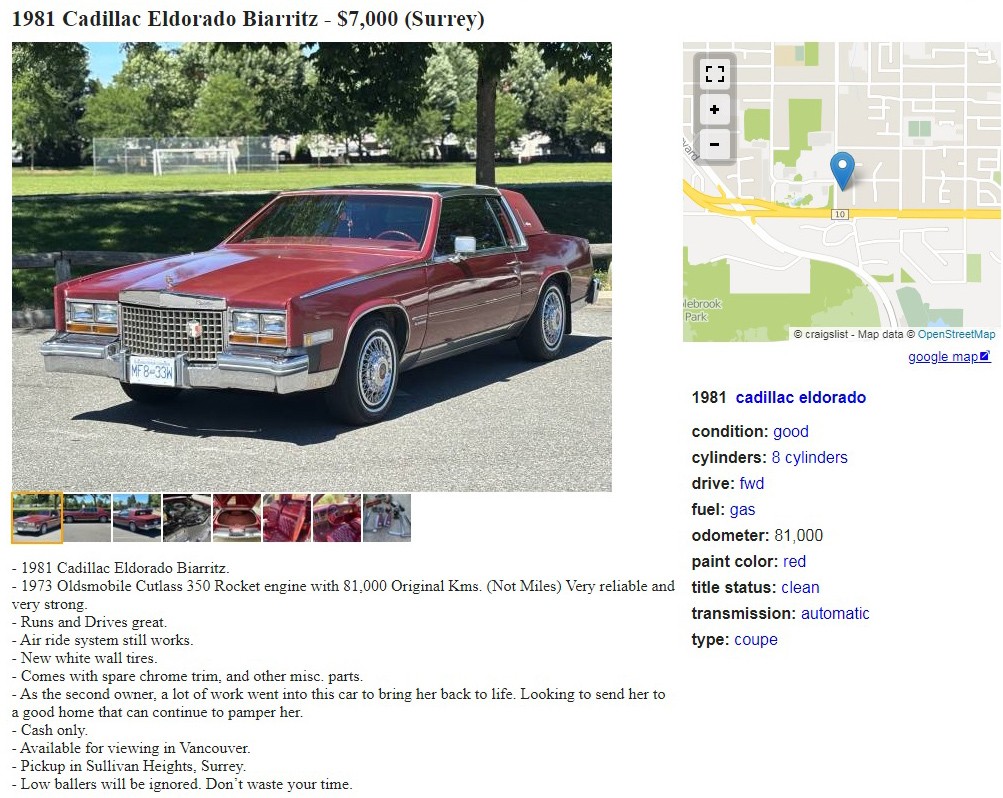 With a dizzying number of engines available, the tenth-generation Eldorado was sure to please almost any buyer, or so Cadillac thought. A couple of the choices (a 350 diesel and a 368 V8-6-4) didn’t work out quite as well as they had hoped. This 1981 Cadillac Eldorado Biarritz is posted here on craigslist in Surrey, British Columbia, Canada, and they’re asking $7,000 (I’m assuming U.S. dollars?) Here is the original listing, and thanks to Curvette for the tip!