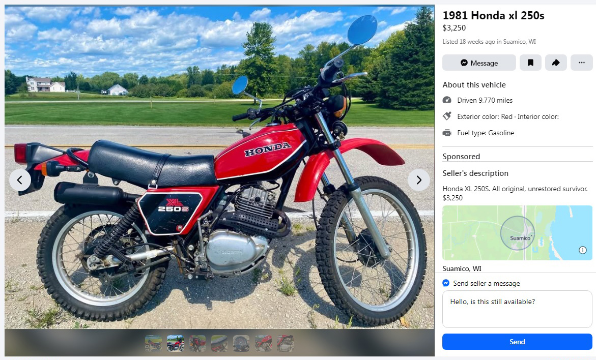 Yeah, but what if you work from home?! It’s the best of all worlds, then, you can ride your XL250S every day on and off the road whenever you want. Just load up your AI image on your Zoom/Teams background and hit the trails. I mean, not that I condone such things… But, as we all know, life is short, all work and no play, etc. At 262 pounds, this bike is fairly light for a 250; my ’76 CB200T street bike is about 310 pounds for a comparison. The asking price is about twice what this bike would have cost new, but then again, how much are you asking for your 1970 Chevelle compared to what it cost new?