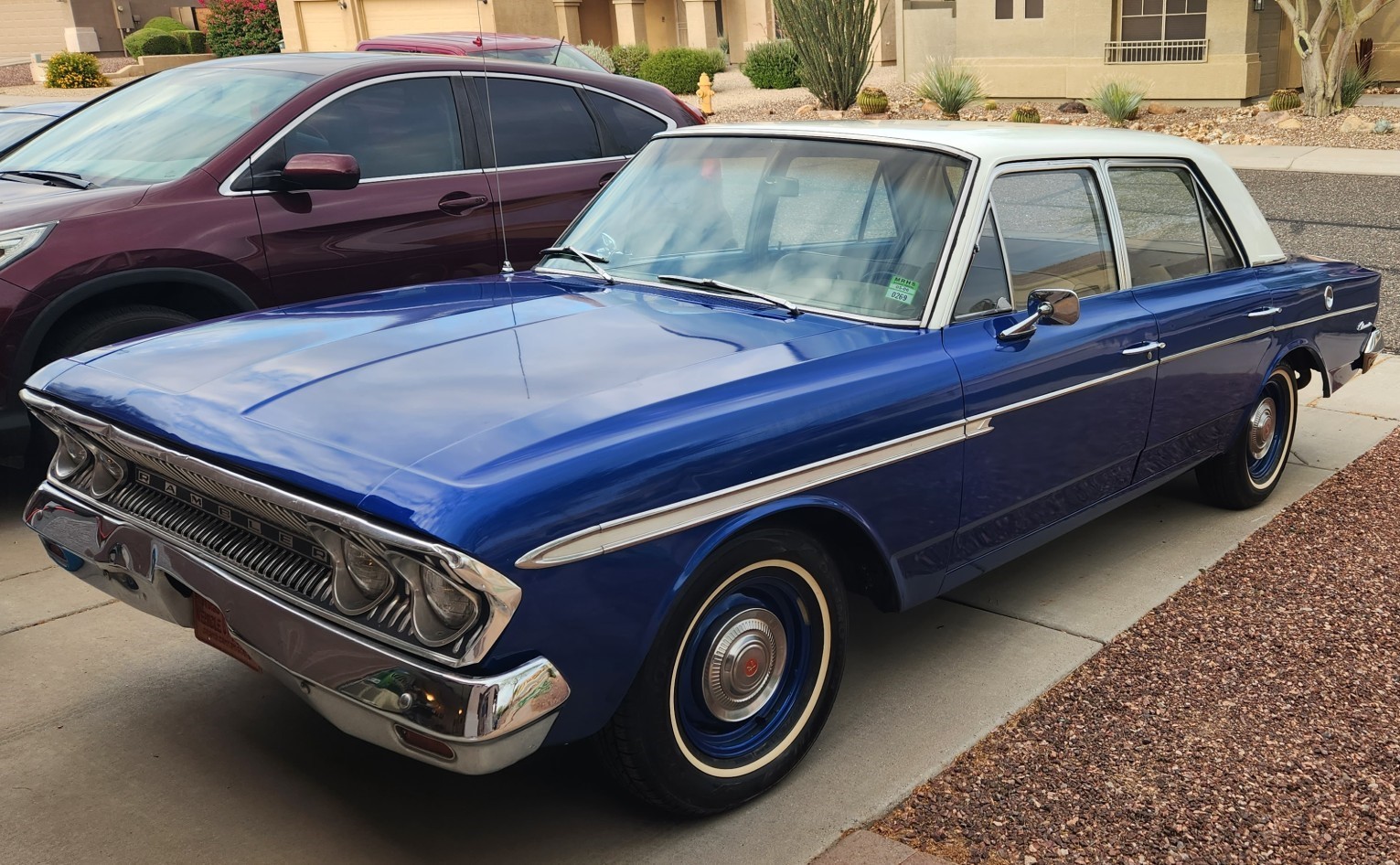 Belonged to gramps, see? I’m not that far off. Grandparents moved to AZ. from up north and took the new, at the time, Rambler with them. There were a few Rambler dealers in AZ. I’m sure, but always a regional make. If it has A/C, that would be the indicator it was bought down there. That dinged front bumper, did you know the front and back bumpers were the same? Again, more info would narrow down the interest some, the automatic is a big plus, regardless of what’s in front of it. Doesn’t look like they were fancy folks, and I agree with no V8 badges, probably has the 6. If interested, I wouldn’t drag your feet on this one.
