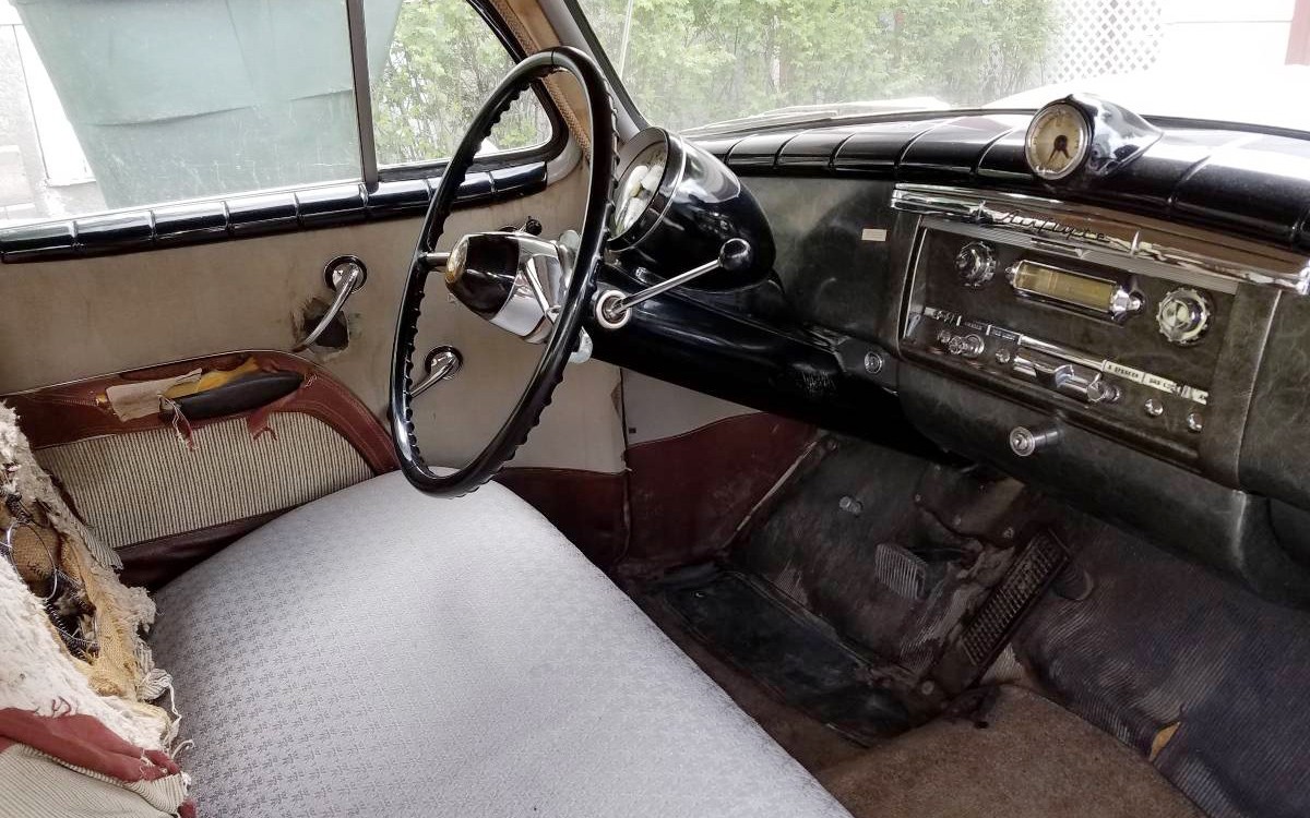 There’s some work to do on the seats and door panels but any good upholstery shop should be able to make them look like new again. Yes, this car has the $31.50 optional split reclining front seat backs. The 1949 and 1950 Nash Ambassadors had the super cool Uniscope gauge cluster mounted on the top of the steering column. The back seat has limo-like legroom and although the seat fabric is stained a bit it looks like it’s in nice shape back there other than some possible damage on the top of the seat backs.