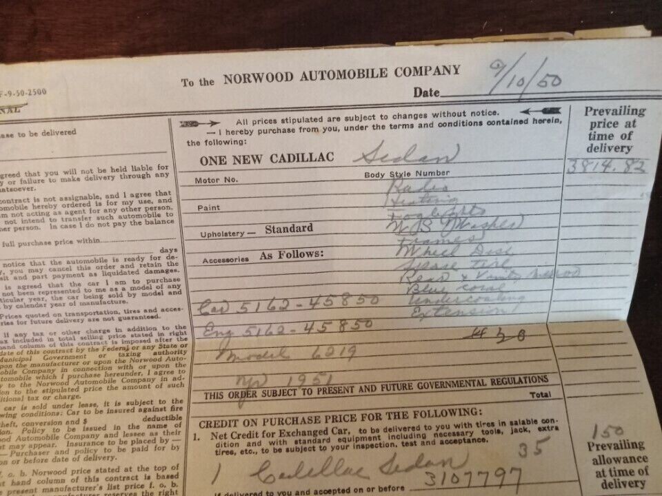 Don’t you love it when old cars and trucks come with the original sales invoice? This one is dated September 10, 1950, showing that the owner’s dealership purchased the car from Perter Fuller Cadillac in Boston, the first and one of the largest Cadillac dealerships in the country, for $3,814.82. This was an expensive purchase considering the average car cost $1,500, the average home cost $9,000, and the average household income was $3,510 back in 1951.