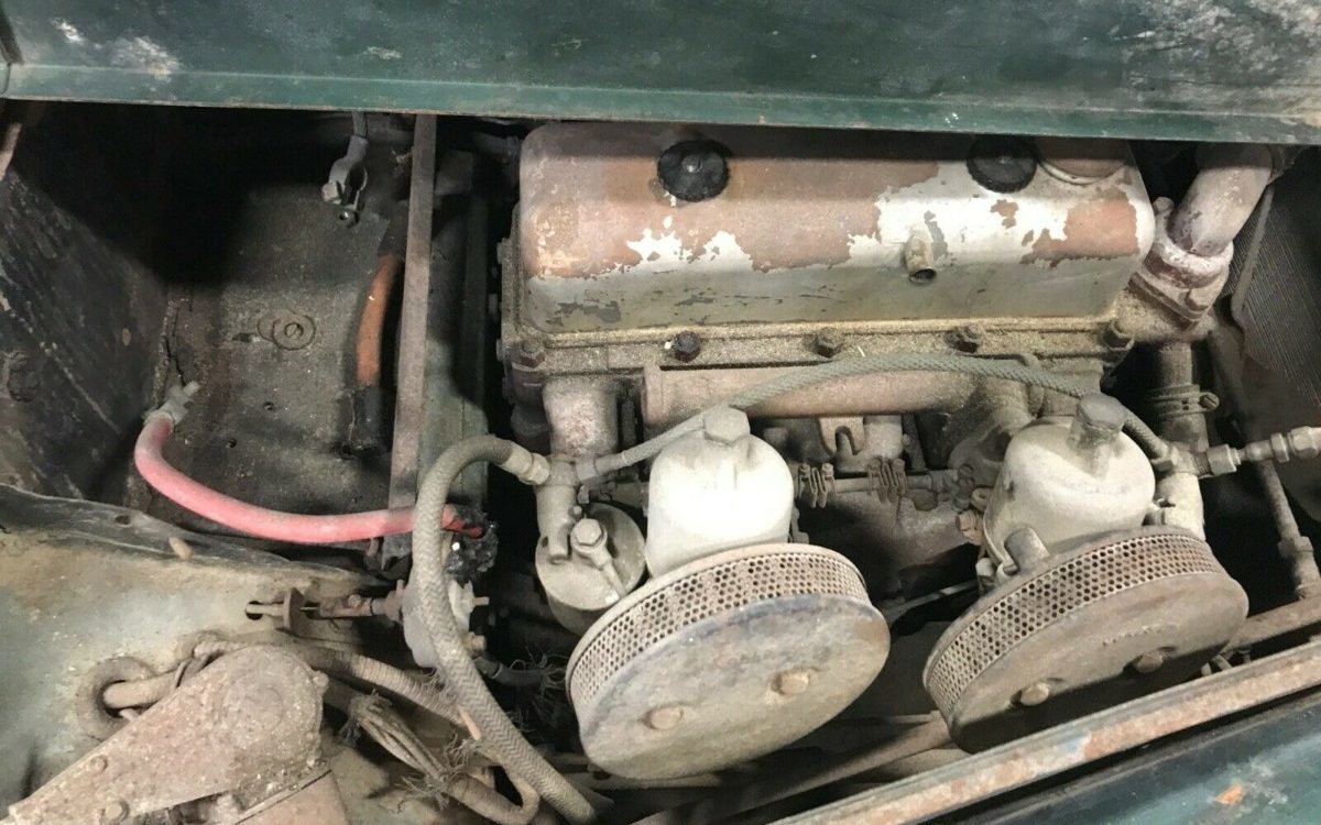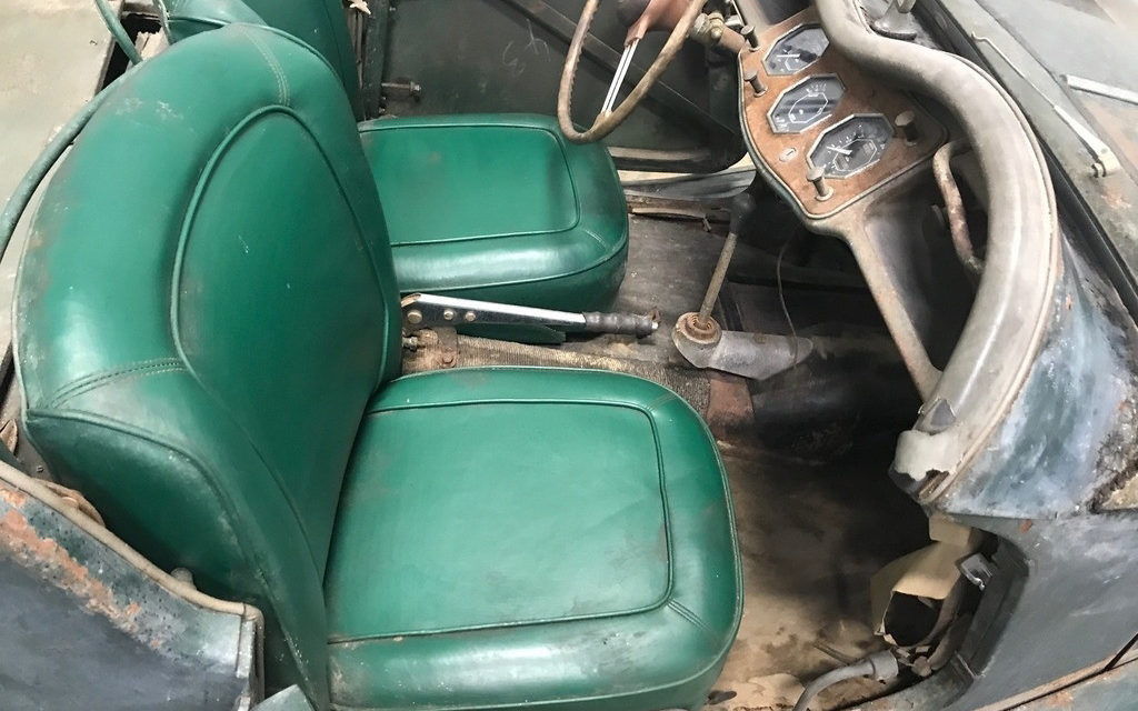 Also somewhat believable, the interior is said to be all original. Side curtains are included, but there’s no mention made of the top. The photos show a top frame donning fabric that looks nonsalvageable. I’ll assume the seats have been recovered as they are in considerably better shape than the rest of the car and, again, research shows the original TF seats were pleated.