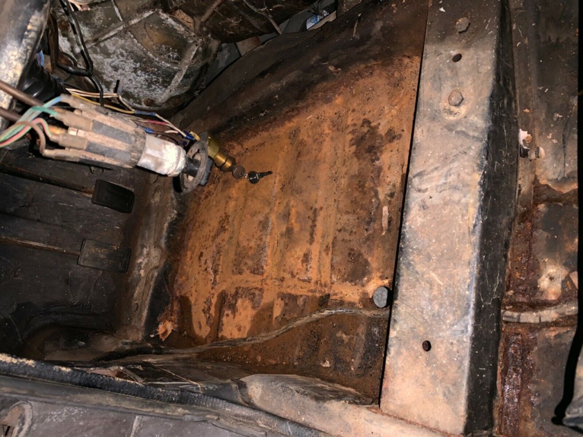 I was truly expecting to see holes here (the one that is visible is a drain hole) but the floors look really solid. I wondered if the seam towards the top of the picture is a sign of a replacement floor, but I really can’t tell from this picture. Either way I’m not concerned. That switch hanging down is the wiper/washer switch, the with the two largest “wires” coming off it being washer fluid tubes; you actually pump the knob in and out to spray fluid!