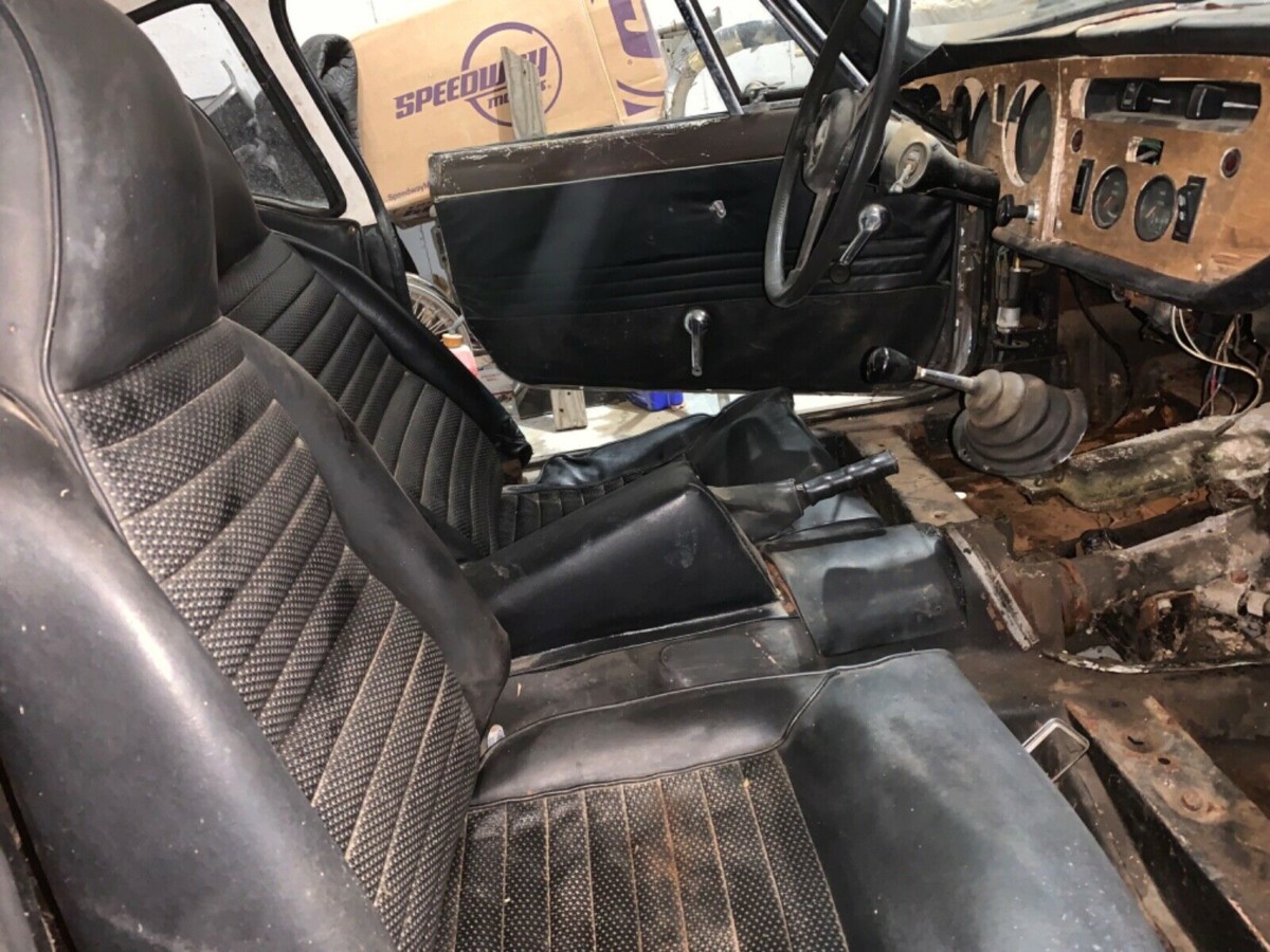 Don’t be concerned about the missing tail light and turn signal lenses, they are readily available. Also, one of the places GT6s are known to rust is that rear seam just above the license plate light assembly, and it looks pretty good on this car! This is the GT6+ model, generally regarded as the best GT6 amongst US enthusiasts. Interestingly, this model was sold in the UK as the Mk. 2 for reasons best known to others – the TR line also had two nomenclatures when the “Plus” was introduced in 1968; the rest of the world got the TR5 while we got the TR250. Basically, a GT6 is a Spitfire with the small six-cylinder Triumph engine; there are a lot of detail changes as well but that’s it in a nutshell. The wheels are aftermarket but nice period aluminum slots.