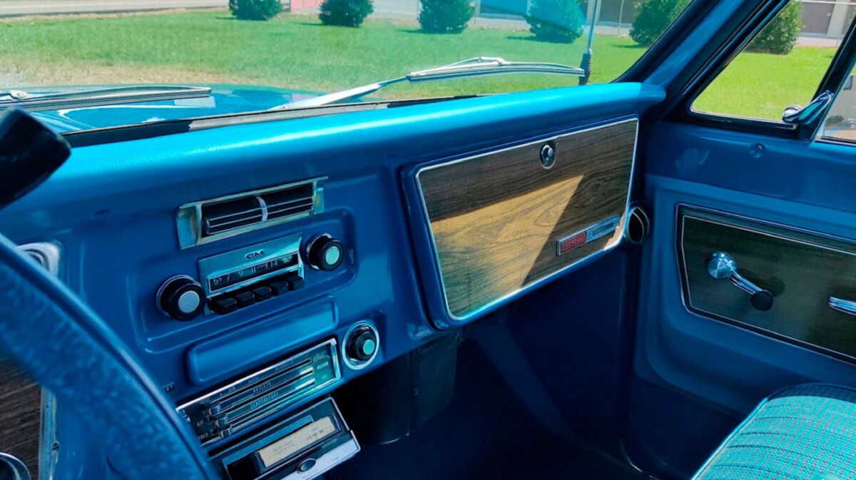 This C10’s stunning presentation continues when we turn our attention to its interior. I had to carefully examine the supplied photos to find anything worth criticizing, and I needed to mark it pretty harshly to do so. The faux chrome trim around some aspects of the gauge fascia is worn away, exposing the black base. A search reveals some excellent products that address the shortcoming for a few dollars and utilizing one of those would have a positive impact. Otherwise, the Blue cloth and vinyl upholstery is spotless, and it seems the same is true of the matching carpet under the protective rubber mat. There are no cracks on the dash and pad, and the woodgrain highlights across various interior surfaces are free from wear and lifting. The owner indicates the air conditioning blows ice-cold, while the Cheyenne also features an AM radio and what appears to be a factory under-dash 8-track player.