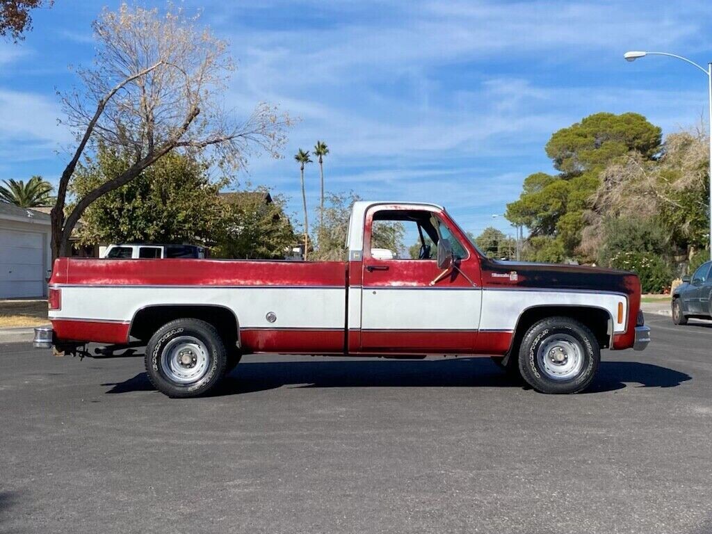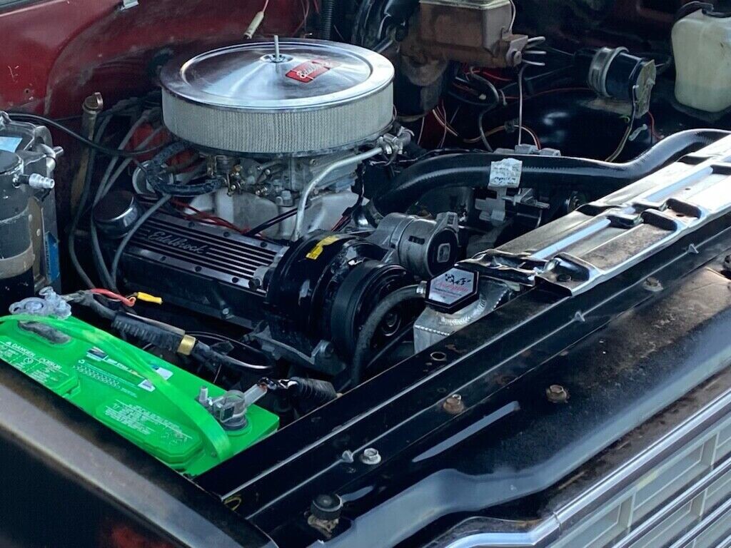 The truck is powered by the original 350 cubic inch V8 engine that has some performance parts added to it including a high-rise aluminum intake manifold. The 350 cubic inch V8 engine in 1975 was designated the LF5 and was rated at 175 horsepower when equipped with a 4-barrel carburetor. The engine produced 275 lb-ft of torque and was produced from 1973-1986. The engine is dressed up with Edelbrock valve covers and chrome air cleaner. The engine has a new water pump, alternator, brakes, radiator, and tires in addition to the aluminum manifold. The engine is said to run well and not smoke, leak or knock.