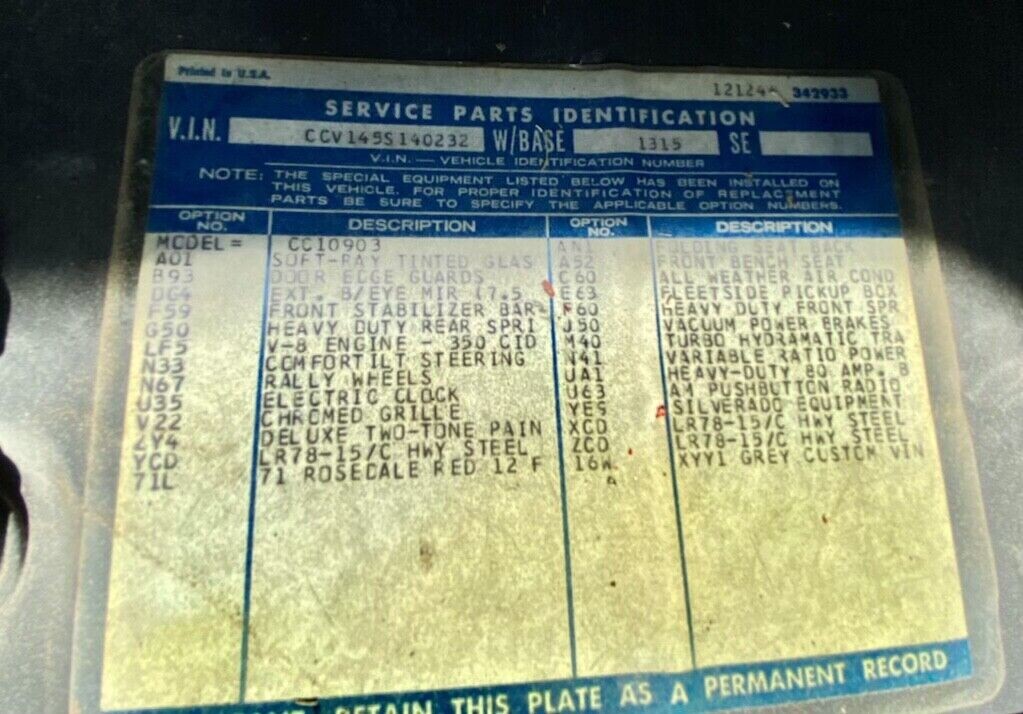 Above is a list of the RPO codes and build sheet. You can see the truck was well-equipped with power steering, power brakes, tilt steering, and air conditioning.