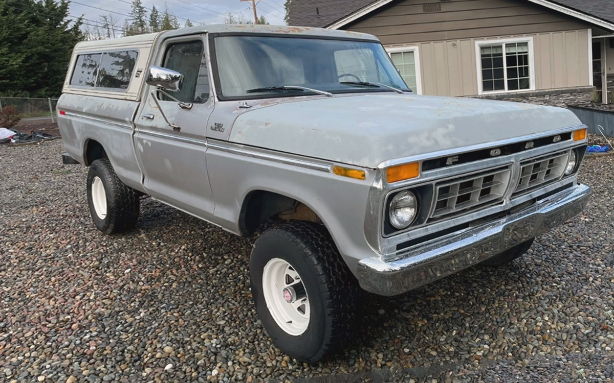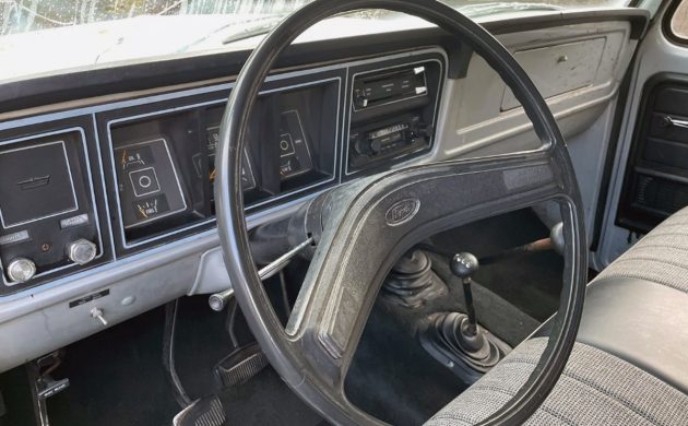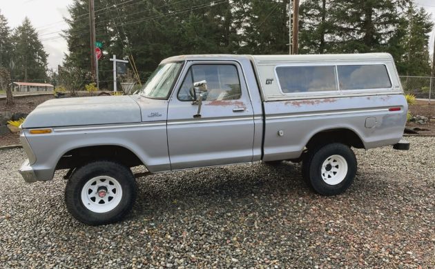 I prefer “patina” when a heavy amount of surface rust isn’t involved, like this regular faded paint. “Silver Metallic” was Ford’s creative name for this color, and you can see that it’s faded differently in various spots around the truck. The seller has this one-family-owned, 4-speed, 1977 Ford F-150 Custom 4×4 listed here on eBay in Tacoma, Washington. The current bid price is $5,800, and there is no reserve!