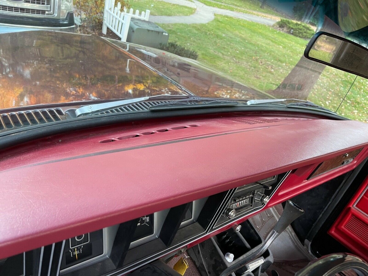 The interior of the truck is red and is a great color to go with the black exterior. It gives it a bit of an upscale look. From the pictures (none of which show the whole interior), everything looks to be in good condition as well. There are no cracks in the dash, and the door panels and headliner are free from major defects as well. Unfortunately, the seat has an aftermarket cover on it, which normally means that there is damage being covered up. The dash had a pad on top to protect it though, so hopefully, that is the case with the seat as well! The listing says the original 8-track player is still working, which is pretty cool.
