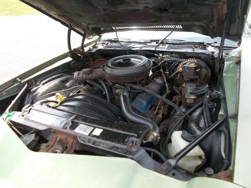 The green is a nice change of pace, but it seems as though the carpet has been replaced, as it doesn’t come close to matching anything else in the interior. It also has a rear defogger as well! Fix or replace headliner & sun visors, treat door bottom edge corrosion and enjoy! GLWTS!! :-)