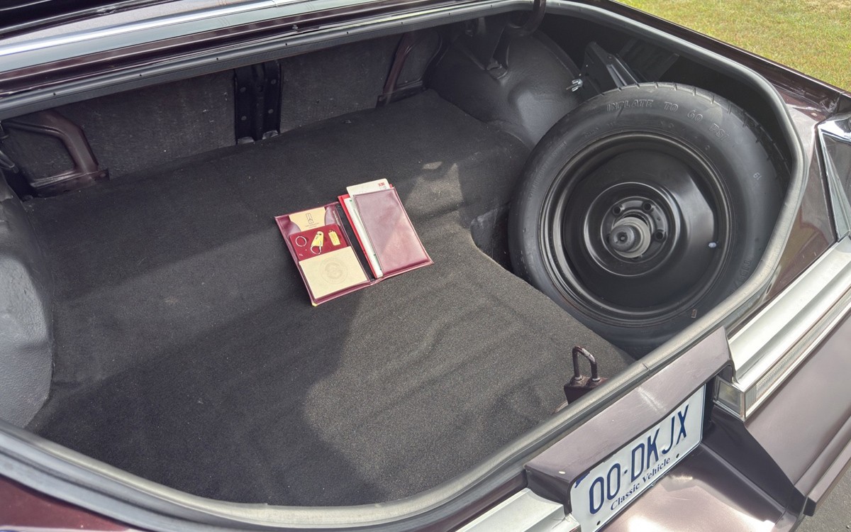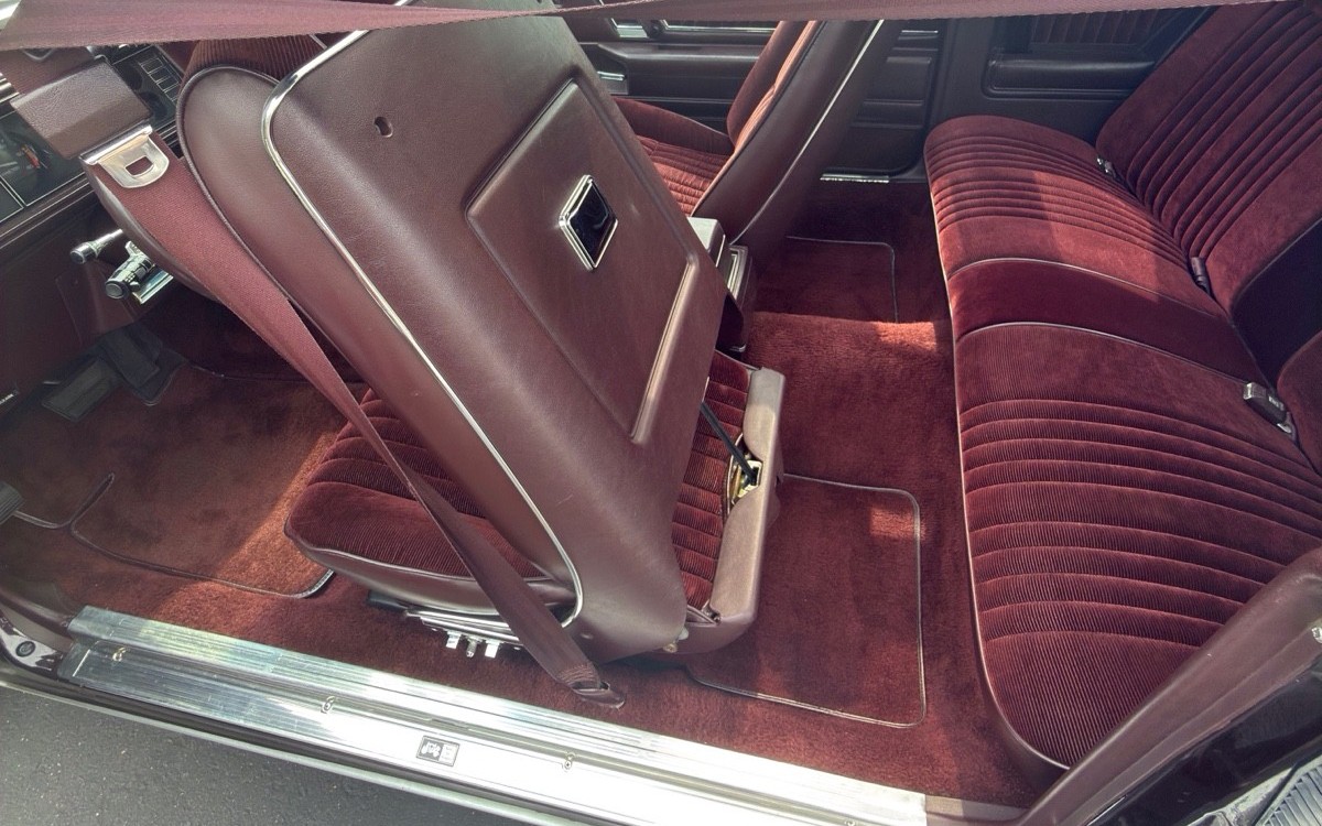 There are basically no flaws inside or out, other than a few normal, small scratches or nicks on the original Burgundy Metallic paint, and some brushing wear (I just made that up) on the left side, bottom seat bolster from getting in and out of this car over the decades. The burgundy Bronte velour seats look fantastic, both front and rear, and the trunk is clean enough to do surgery back there. Not that you would.