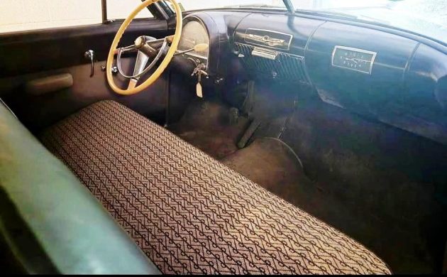 There’s no picture showing the 346 cid (5.7L) Cadillac V8, but here’s a close look at the “Sedanette” body style with the sloped rear window line continuing to the bumper, and what a bumper! Think twice before thumping this Cadillac in any modern car. If this coupe’s originality checks out, would you restore it or simply shine and drive?