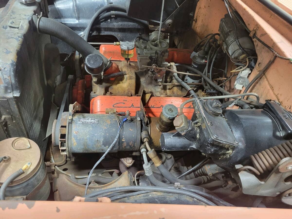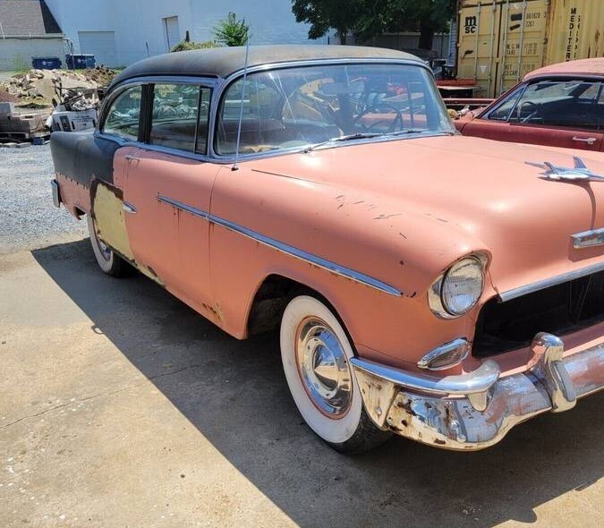 The ’55 Bel Air here wears an interesting two-tone paint job, combo code 627 Shadow Gray/Coral, and we’re told the finish is the one the car left the factory with. This original one-family-owned Chevy has always been stored inside, which no doubt helped in its preservation. While the photos could be better, the body seems to be in decent shape, though we’re curious about the patch below the passenger side back window. We’re told the stainless is good although some of it appears to be in boxes in the trunk along with some other parts.