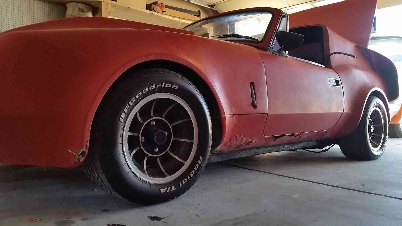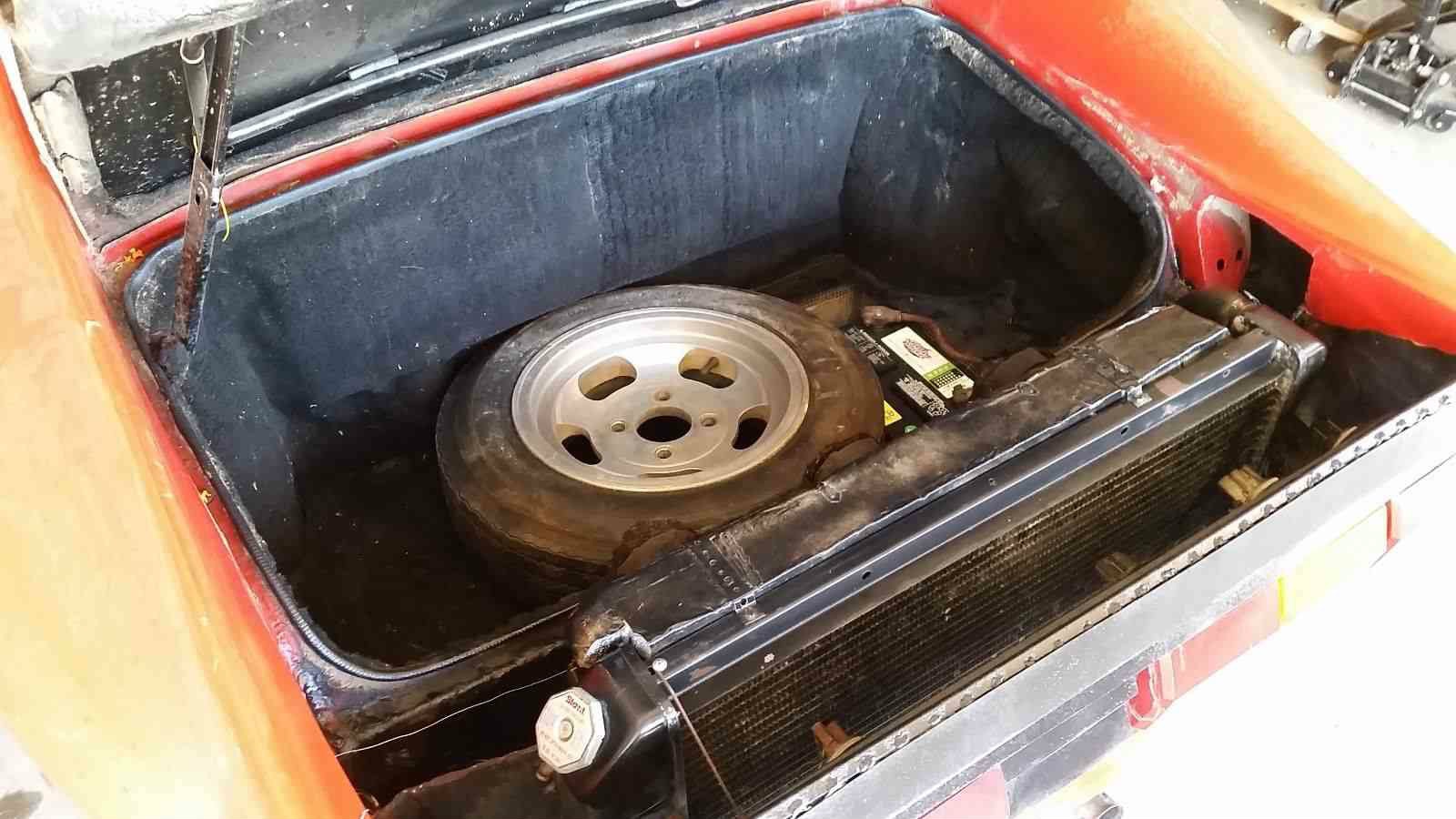You can still see the tail light plinths from the stock Spitfire in this shot. I believe those are Mustang II tail lights. The seller tells us it’s a Chevy truck radiator as well.