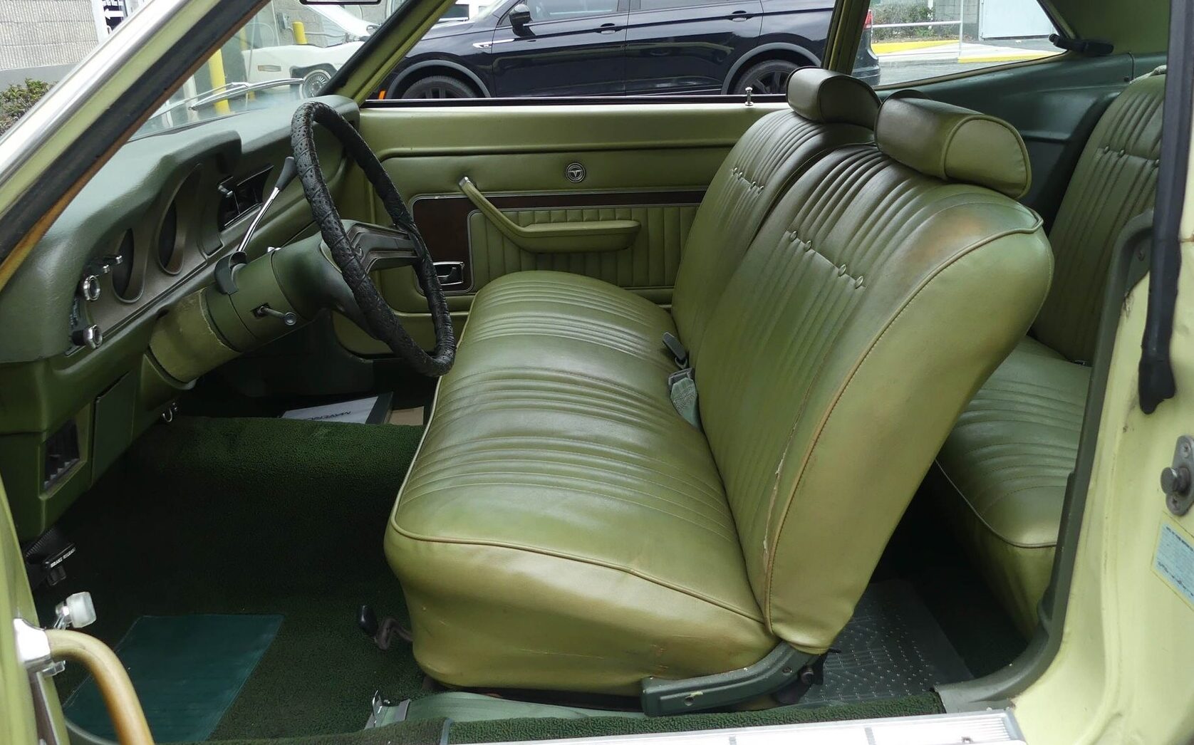 A green exterior begets a green interior. It’s a very austere, but clean vinyl-clad environment. Other than a worn driver’s side seat back bolster, nothing seems to be out of place – and this Maverick is A/C equipped though it’s not said if it’s operational. The dashpad is non-marred and I would venture that the carpet has been replaced – it looks too good to be 47 years old.