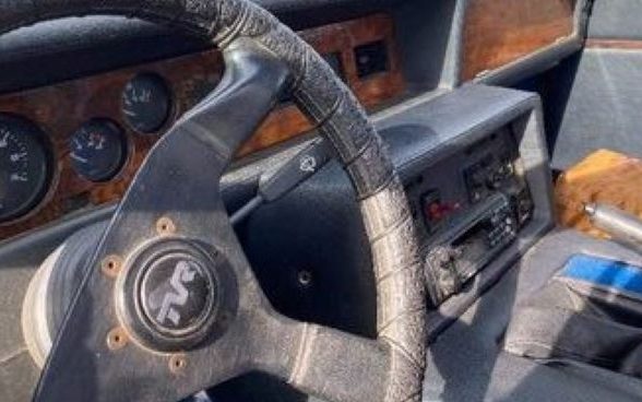 The one image of the interior is not helpful, it looks as if it were shot through a telescope. What can be viewed looks faded and dusty and the securing Allen screws for the steering wheel show as rusty. What is notable, is the flat, angular dash and instrument panel – perfectly in keeping with 1985 favored interior designs. There are no images of the seats/upholstery but the door cards look fine – no sign of degradation noted.