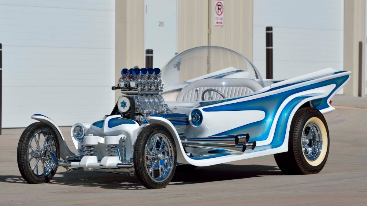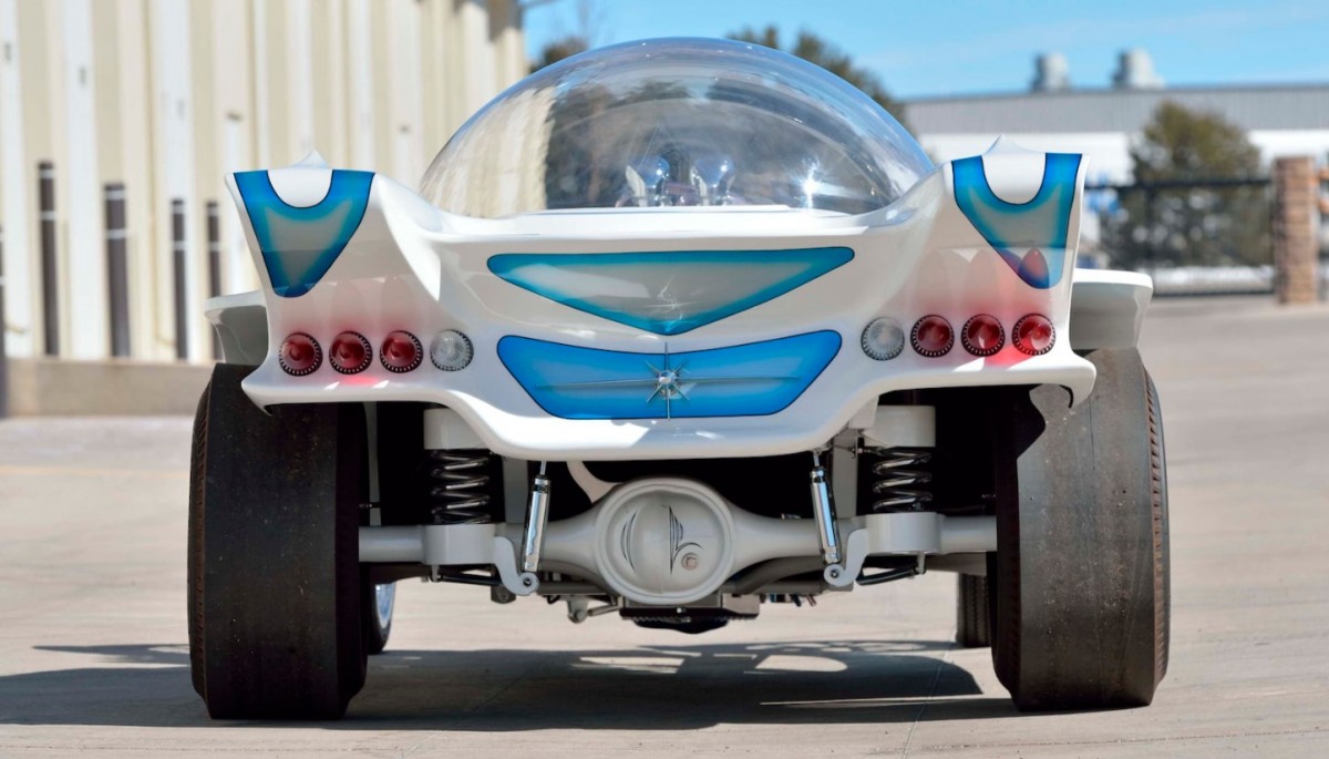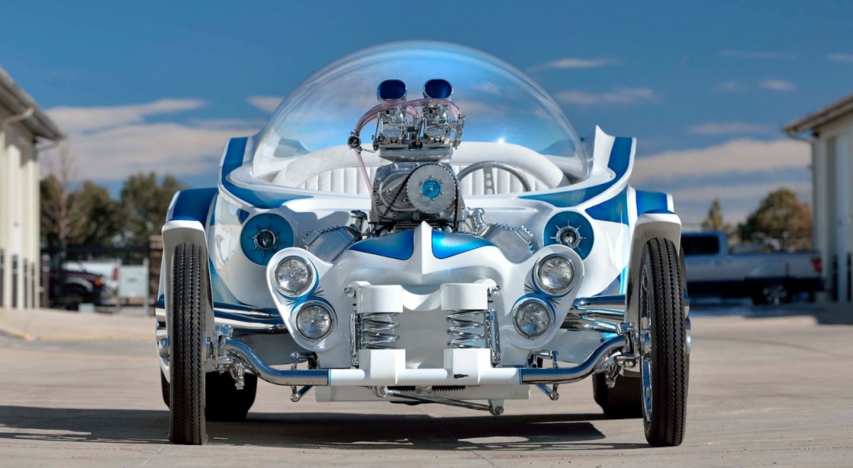 Perhaps the most notable fabrication work that was done on this vehicle is its hand-crafted and gel-coated fiberglass body topped by a 48-inch-wide, 18-inch-tall round bubble top. While no mention is made regarding how cockpit occupants stay cool or warm, this thing looks like it could be an oven in the summer! The bubble is activated to open or close using convertible-top cylinders. The body wears a combination of House of Kolor White Pearl paint with Silver Kandy Blue fogging.