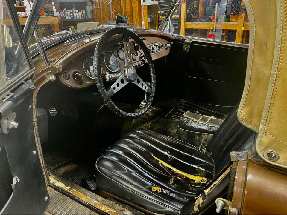 I think I’d ditch the rear overriders, given the lack of originality of the rest of the car, just to clean up the rear appearance a bit. The top and side curtains, while showing some wear, are certainly serviceable so you can unsuccessfully use them to keep dry. Been there, done that!