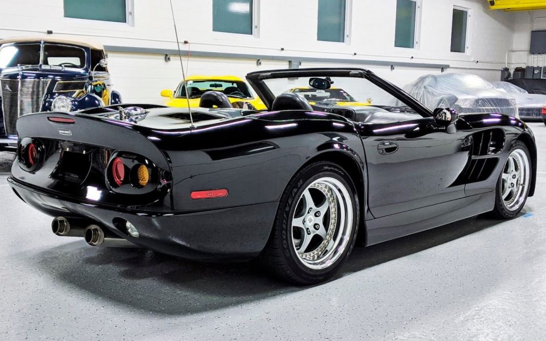 We look now at the example before us. The seller is apparently a collector/dealer and tells us that it is legit with papers, has never been titled, and has only covered about 2,600 miles of pavement since assembled. We can see a rather odd-looking specimen, as compared to the production cars, but that is to be expected since it wasn’t meant to be the final draft. Finished in black, it’s allegedly very rare.
