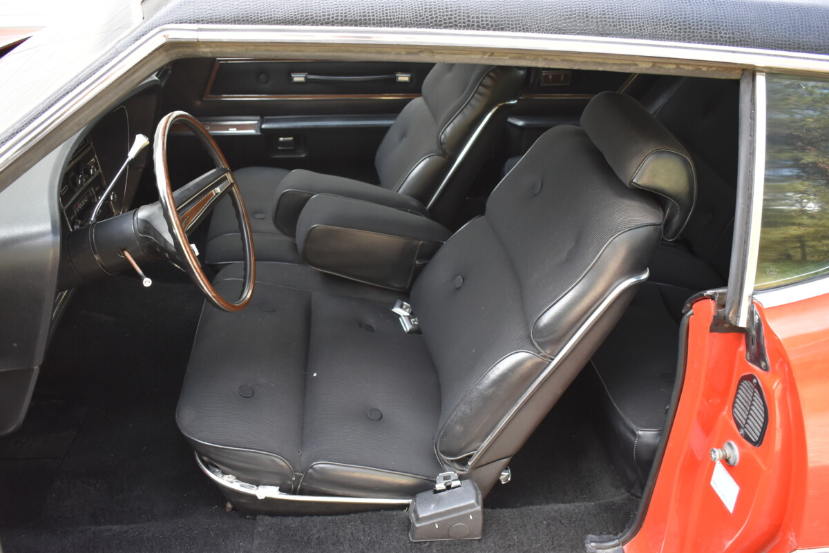 The biggest stylistic change was the first year of the mandated new energy-absorbing front bumpers. Some think the large size of the Thunderbird pulled this off better than smaller cars. And even though the oil crisis began in October 1973, Thunderbird sales were strong. 87,269 were sold, which at the time was just short of the record 90,843 T-Birds sold for the 1960 model year. It’s hard to find fault or “red flags” with this car’s exterior. The original Bright Red paint looks shiny and very presentable, the black Odense-grain vinyl top looks like new as does the chrome, glass, lenses, and trim. What their sales brochure called “a vacation-sized trunk with 13.9 cubic feet of capacity” is fully lined, clean, and houses the original factory spare tire. The wire wheels may not be everyone’s cup of tea, but I don’t mind them too much.