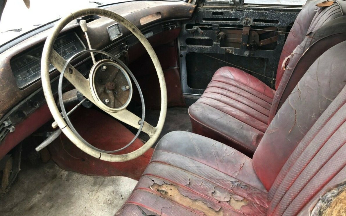 The elephant in the room is the grille, hood, valance and left fender, it has suffered a bit of a wack and will take some doing to repair – the assumption is that the grille may need to be replaced. The original finish is intact but mostly finished off with lots of evidence of surface rust. The seller does indicate that “The car is very dry the bottom of the doors, fenders, and rear quarter panels are in great shape. The floors are also very solid just a bit dirty and dusty and need cleaning up.” There is an image included of the underside and it does, in fact, appear sound. The seller claims that chrome and stainless are in good driver shape but I would strongly disagree seeing that the driver’s side beltline molding is attached with sheet metal screws – not even driver quality. Hopefully, the trim is repairable because replacement is probably close to out of the question on a car of this rarity. Of final note is the missing windshield, third car in a row that I have reviewed with glass so clean it looks like there’s none there.