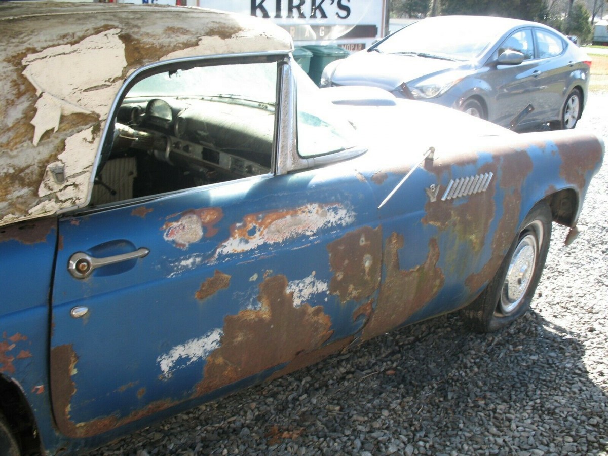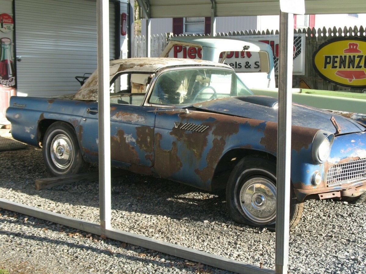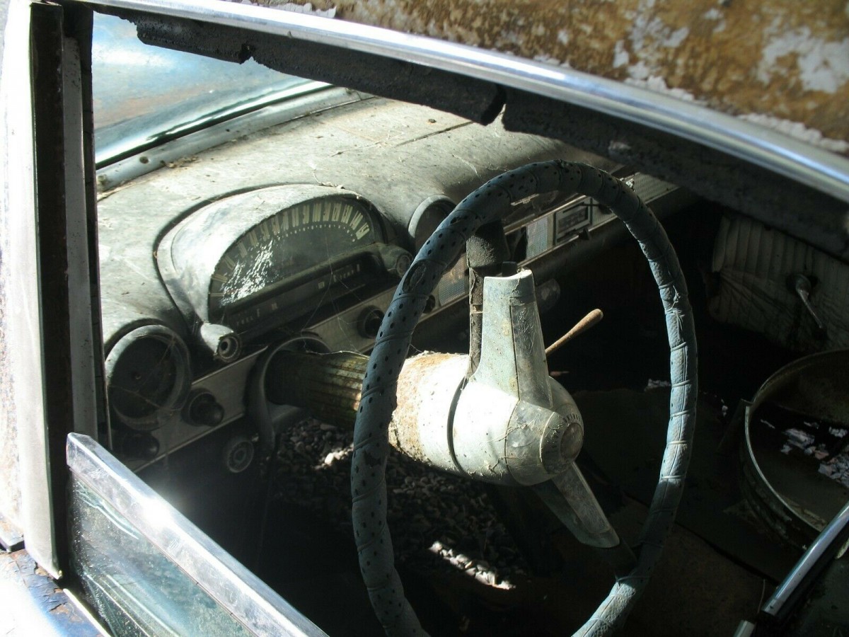 Betcha the original black factory finish would have fared better after all these years than this horrible blue repaint revealing poor prep. Looks like the paint itself caused all the premature surface rust! Interior looks nice and, hmmm, crusty. No monetary premium by it being the 5th to last car of the 55s. The retooled 56 was hardly a departure so there is no historical significance to this late 1955 production #.