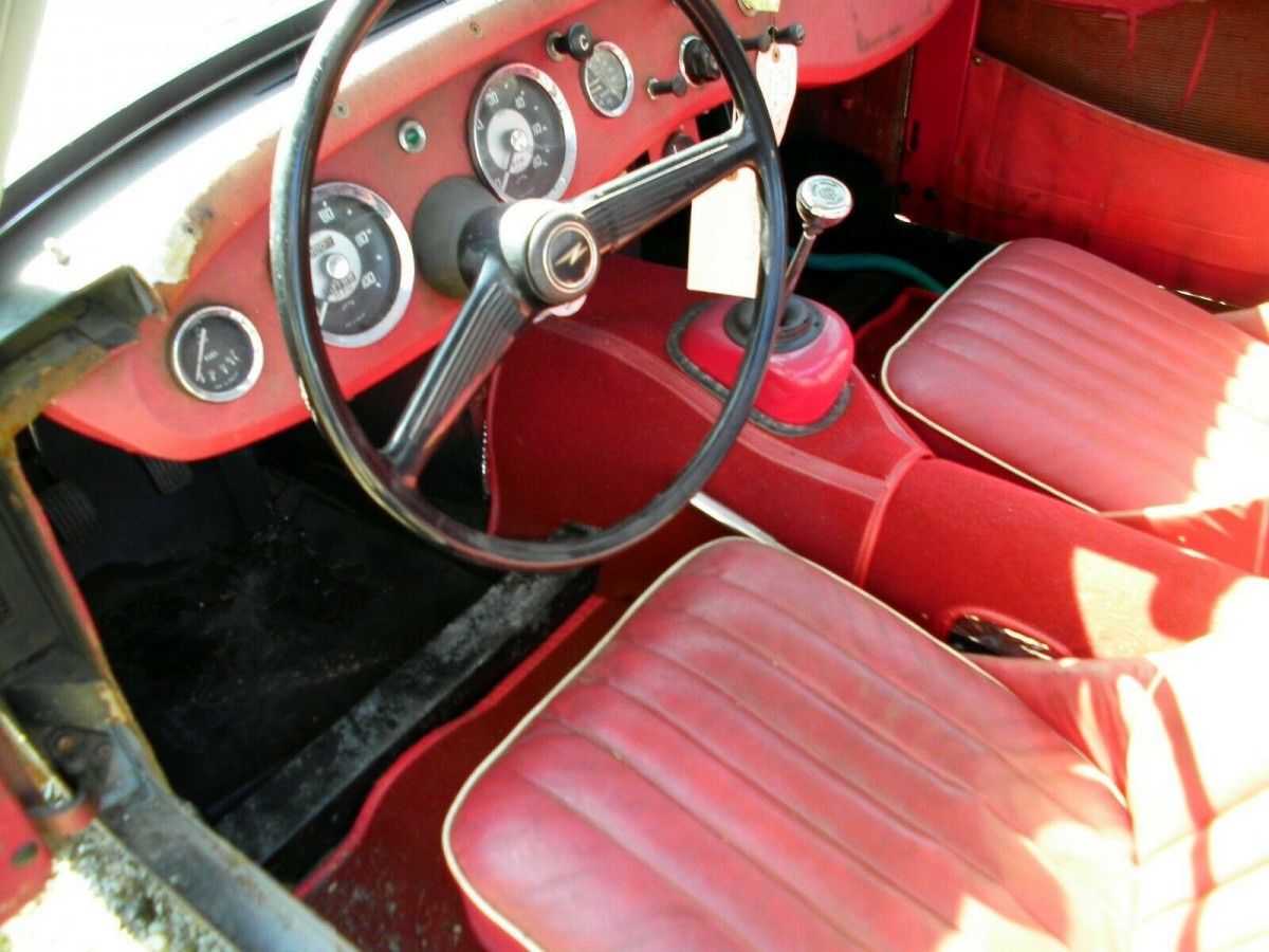 This is a second-year example of the “Bugeye” Sprite that was manufactured from 1958 through 1961, a hit with American foreign car enthusiasts of the time. The photos are a bit fuzzy, but this pint-sized roadster appears to be a solid example with a black exterior complemented by a presentable red interior. There is a black folding top and side curtains with sliding windows which all appear to be in decent condition.