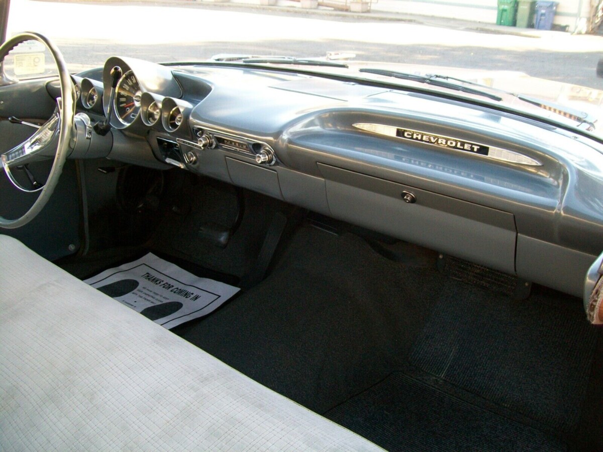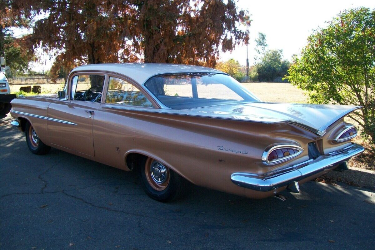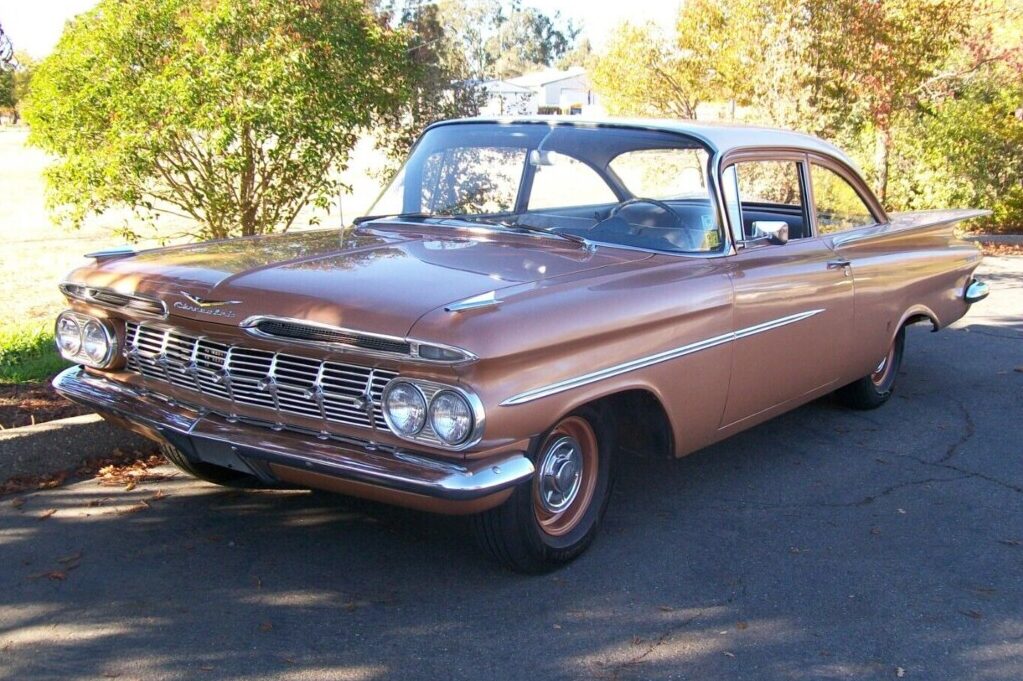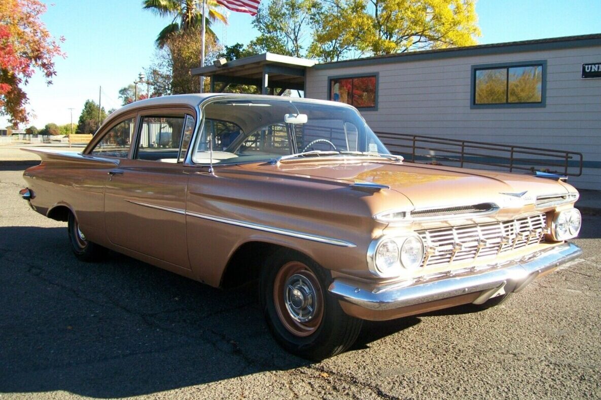 I looked for one of these 2 dr post cars for a few years after I sold my ’59 El Camino, and they were like nonexistent in the Northern California area. So now this comes out of the woodwork, too bad I am not in the market now. I see one thing on this old girl that just isn’t right in the listing, and I spotted it right off since I know these ’59 bowties pretty well, if you look closely at both front and rear bumper, they are not original to a true California car, tells me they are from the Midwest or east side of the country. A real California ’59 Chevy (all models) would have the one-piece bumpers. That would be a good question to present to the seller IMO.
