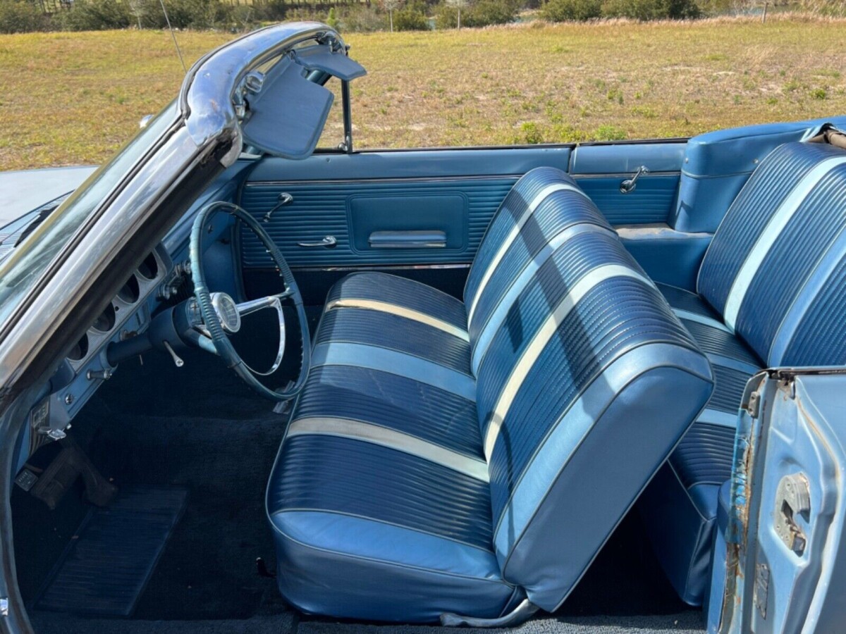 The interior is snazzy in the way only pre-1970s cars were – with bold fabrics and colors. The seller says this interior is all original, marred only by a small tear on the passenger’s seat. The windows are said to crank easily, and the power top works well and looks decent.