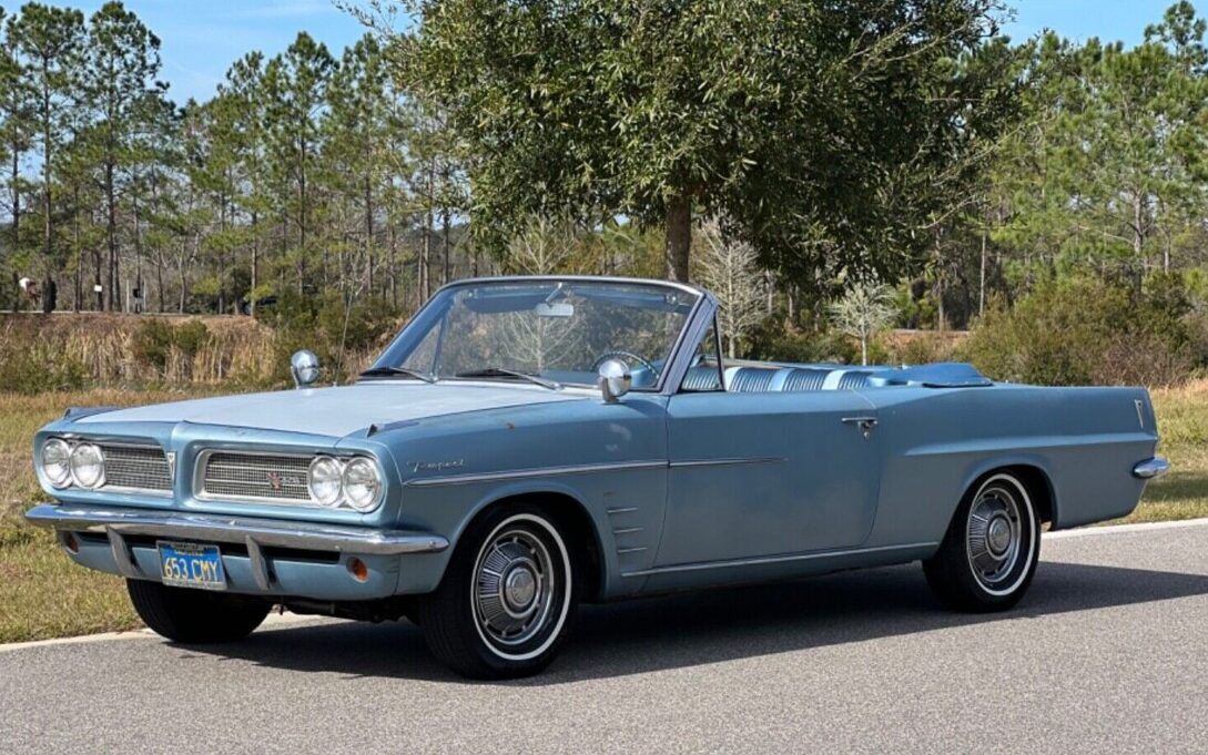 The Pontiac Tempest arrived on the scene at the Paris Motor Show in 1960. Thanks to John DeLorean, the Tempest was both innovative and successful in its compact class. Motor Trend named it Car of the Year in 1961; Road & Track glorified its spaciousness. Yet the introductory models fell short in important ways. The car was designed around a rear transaxle, which helped balance the engine’s weight – but that engine was only a four-cylinder with the decibel level of a cement mixer. The swing axle rear suspension was another of its liabilities. By 1963, Pontiac gave the car a more substantial stance – it was several inches longer and wider than the ’62 – along with a 326 cu. in. V8. The V8 was heavy, so the near-perfect front/rear balance was compromised. But the car now had 260 bhp, and to handle its affinity for oversteering, the suspension was altered. The LeMans was a trim package in the first years of the Tempest’s existence, but it rated its own badge by 1963. Here on eBay is a 1963 Pontiac LeMans convertible, in exemplary “survivor” condition, bid to $9109.09, no reserve. The car is located in Groveland, Florida.