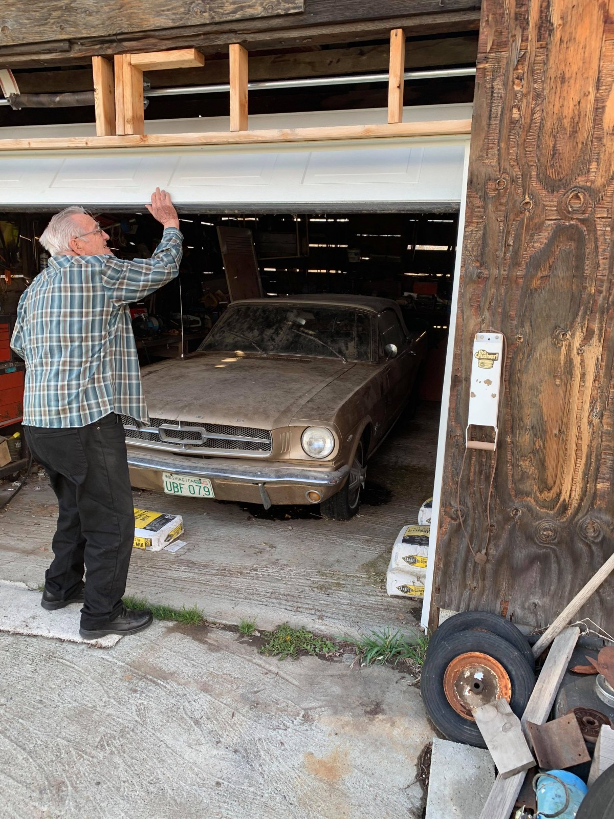 And when he opened the door, there it was! A dusty 1965 Convertible Mustang sitting there with a license plate dated 1985. Chik bought this for his wife brand new. I didn’t even know it was there! I asked if he wanted to sell it and he said to the right person, yes, so I threw an offer out. He said, “well I would like a little more he said that”. He wanted $2,500 and I didn’t even question it. I bought it!