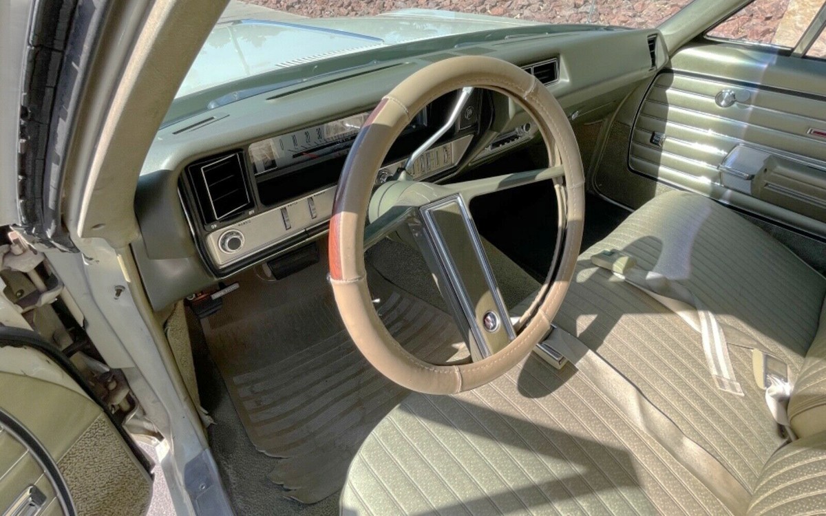 This is a nicely preserved and presented example of a car that isn’t seen often in stock form. That being said, the ’68-’69 Skylarks look awkward to my eyes when dressed up with typical Buick items. “We’ll stick some chrome here, and there, and over there, and I guess we’ll put the break for the vinyl roof here because there’s no obvious place to do it, and let’s add fender skirts to make it look really fancy.”