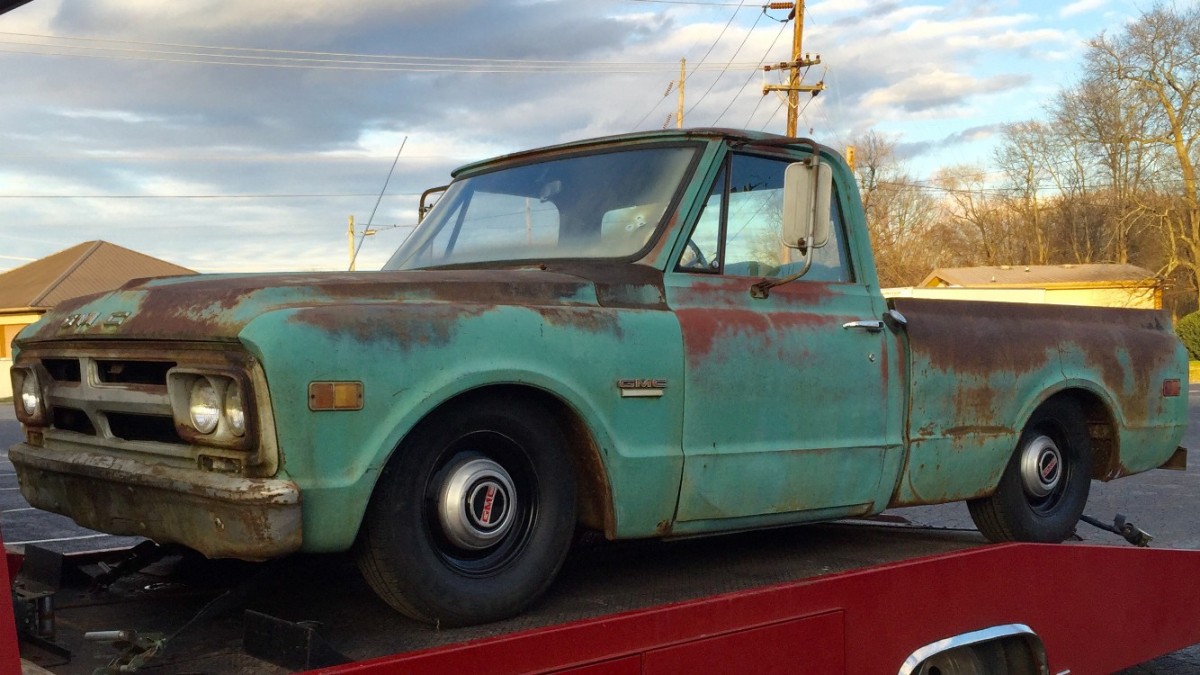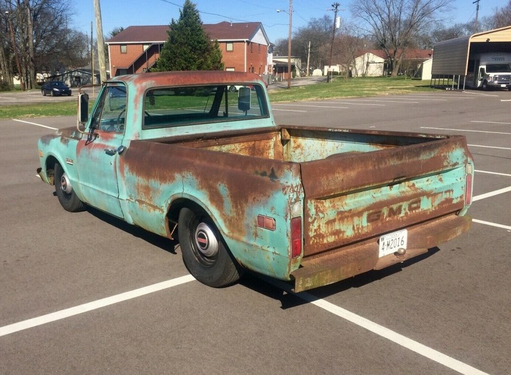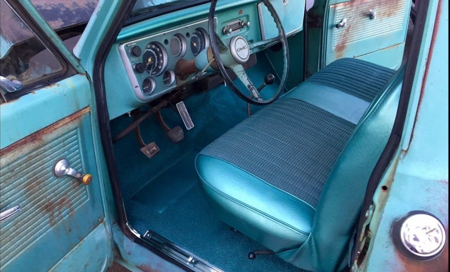 The exterior of the truck has aged well into a patina finish. Where there are a few rust spots in the rear lower bedsides behind the back wheels, this is a pretty solid truck. The truck has been in Tennessee since new. It has its original baby west coast factory mirrors. One of the wheelhouse lips also has a few bumps and bruises. Updates for 1968 included a larger rear window than the 1967 GMC had with the addition of side marker lights. The truck has been lowered with a DJM flip kit on the rear, new shocks, and lowering springs up front.