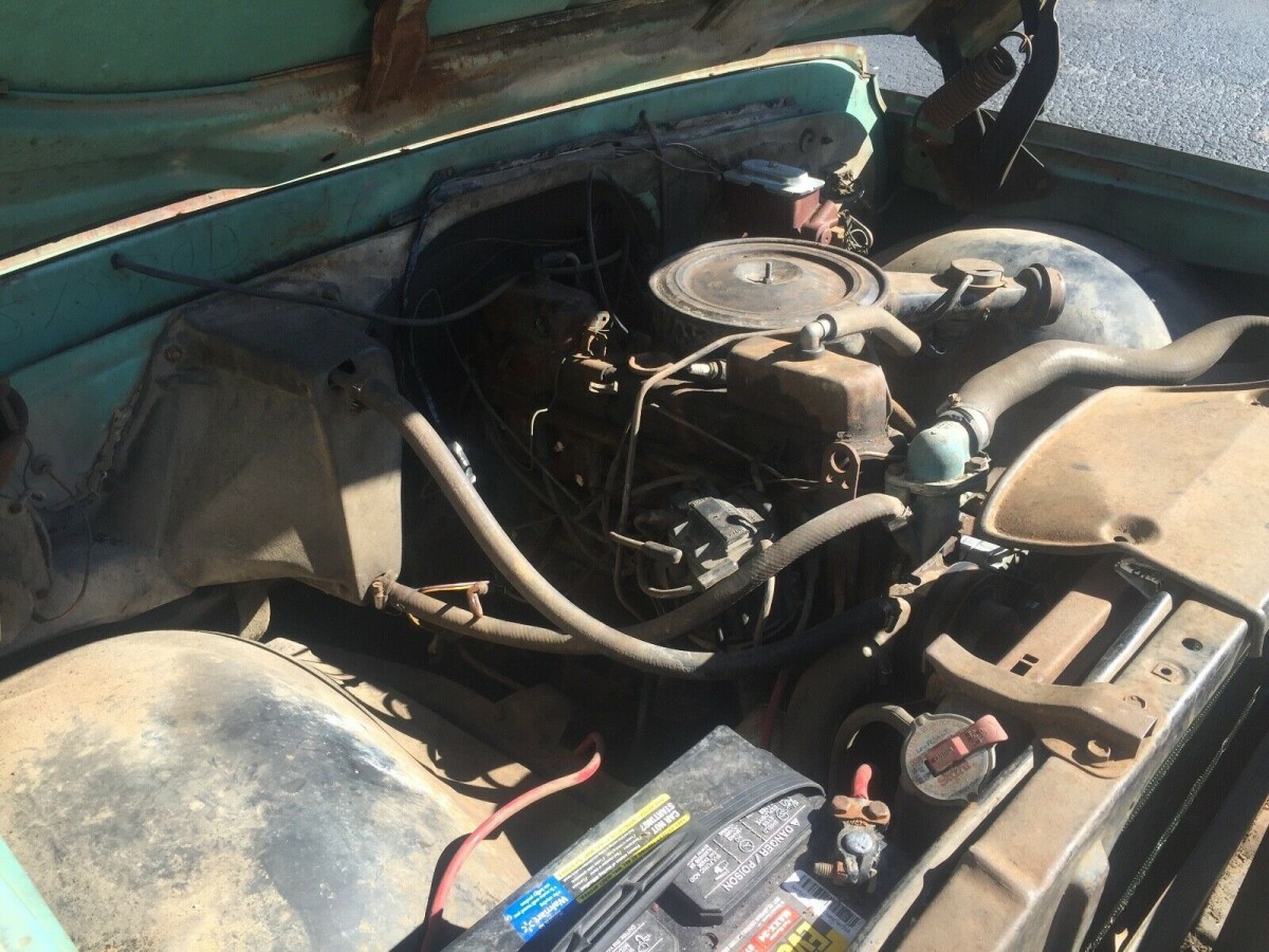 The interior is looking good with new carpeting, new sill plates, new dash pad, and a great looking new Aqua Green houndstooth seat cover. Most all the electrical items work including lights, brake lights, heater blower, and wipers (although the wiper arms are missing). The 3-speed shifter has been moved to the floor and is worn and should be replaced. If a new buyer wants to make the interior perfect, new paint will be needed on the doors and instrument panel along with refreshed vinyl door panels.