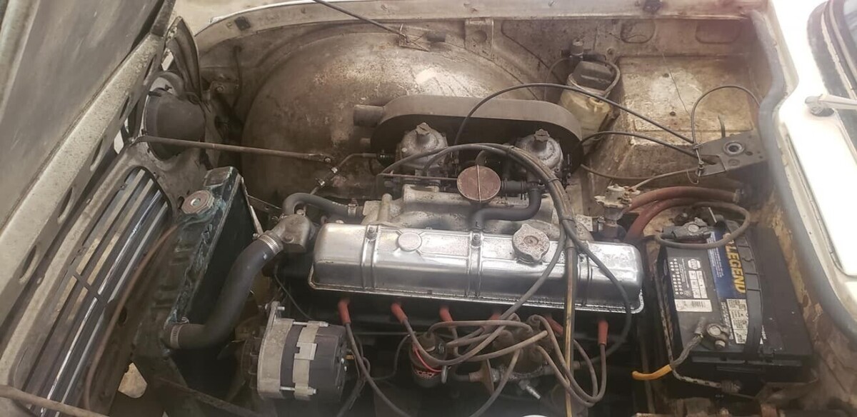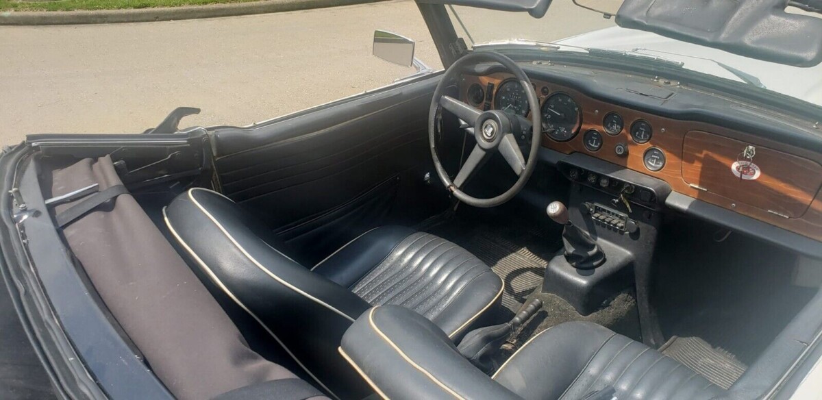 This car was purchased new from a dealership in 1968 by a soldier returning from Vietnam; he recently passed away. Now in the hands of a friend who bought it from the owner’s widow, the TR250 was kept in fine fettle mechanically, apparently driven up until the owner’s passing. The odometer reads 88,000 miles. The 2.5 liter in-line six-cylinder was a big improvement over the TR4’s 2.1 liter four – in Europe! The TR5 utilized Lucas fuel injection, which gave these examples nearly 150 hp and a 120 mph top speed. Meanwhile, back in the regulation-sodden US, TR250s were delivered with dual Zenith-Strombergs, a milder cam, a lower compression ratio, and a disappointing 104 hp. In the end, the TR250 was no faster than the TR4, though the motor generated slightly more torque. The factory transmission was an all-synchro four-speed manual; overdrive was optional. Ok, yes, the engine bay needs a good scrubbing.