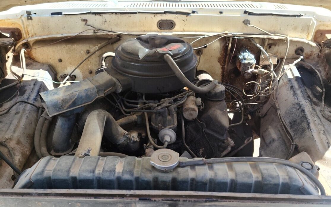 The VIN (F10YRF14848) decodes to: F10 = F-100 2WD, Y = 360 cubic inch V8, RF14848 = Produced in San Jose, California in May of 1969. Other than the seller saying the truck “runs and drives well, both in city and at highway speeds” there is no other information in the ad about the drivetrain. You can tell from the photo that the engine bay looks un-modified. I would guess it could use a tune-up, which is an easy DIY on these particular trucks.