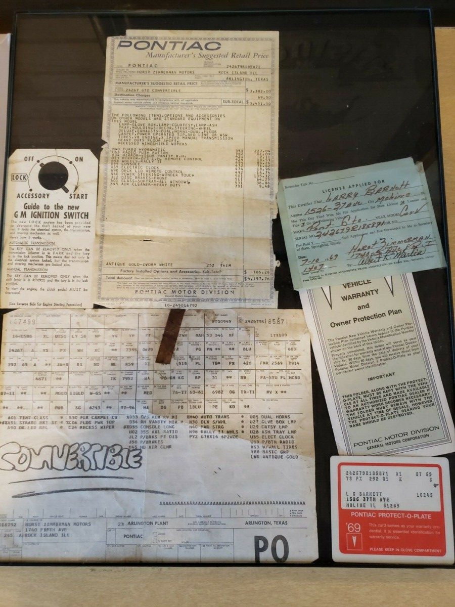 The seller and his father kept all the records on the car and many of the original parts since new. This includes the original window sticker from the dealership and even the original factory Delco battery. The car was kept in a garage from 1993 to 2017. The seller removed the car from the garage in 2017 and got it running so he could enter it in the Pontiac GTOAA National Car Show where it received a concours bronze award.