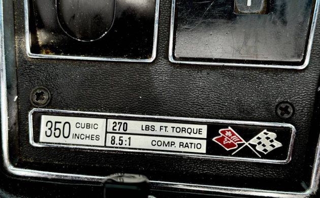 Here’s a neat little badge that tells the owner some of the specifications of the engine in their new Corvette: This convertible has the base L48 350, which produced 190 net horsepower. While net horsepower ratings became the industry standards in 1972, it probably took a little time to grow accustomed to engine outputs that seemed pretty emasculated compared to their immediate forebears, so it’s no wonder that Chevy decided to list the torque rating rather than horsepower.