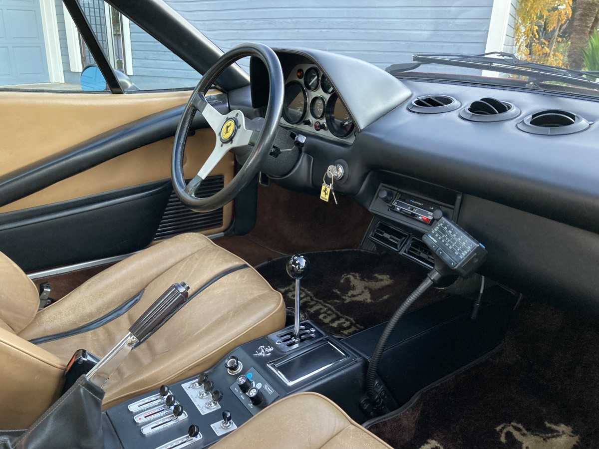 This Ferrari’s interior wins me over with a single feature. I have always found it difficult to ignore any classic car with a gated shifter, which was standard on the GTB. When you consider this classic’s age, its original and unrestored interior is in excellent condition. The seats are upholstered in hand-stitched leather, and while there is some stretching on the driver’s seat, this is minimal and acceptable for a survivor. The remaining leather trim is in excellent condition, and genuine Ferrari mats have protected the carpet since Day One. The beautiful leather-wrapped three-spoke wheel is another feature of these Ferraris that wins my heart. The one on this classic appears perfect, with no visible wear. The dash and console are excellent, and there have been no aftermarket additions. The owner ordered this classic with air conditioning and a Blaupunkt stereo with the funky equalizer stick. Everything works as it should, while the original Owner’s Manual, leather Owner’s Folder, tool roll, and service records are included.