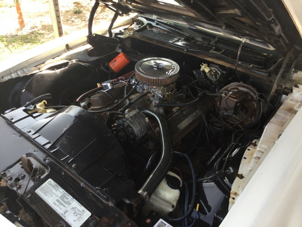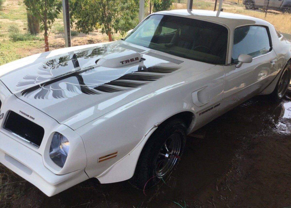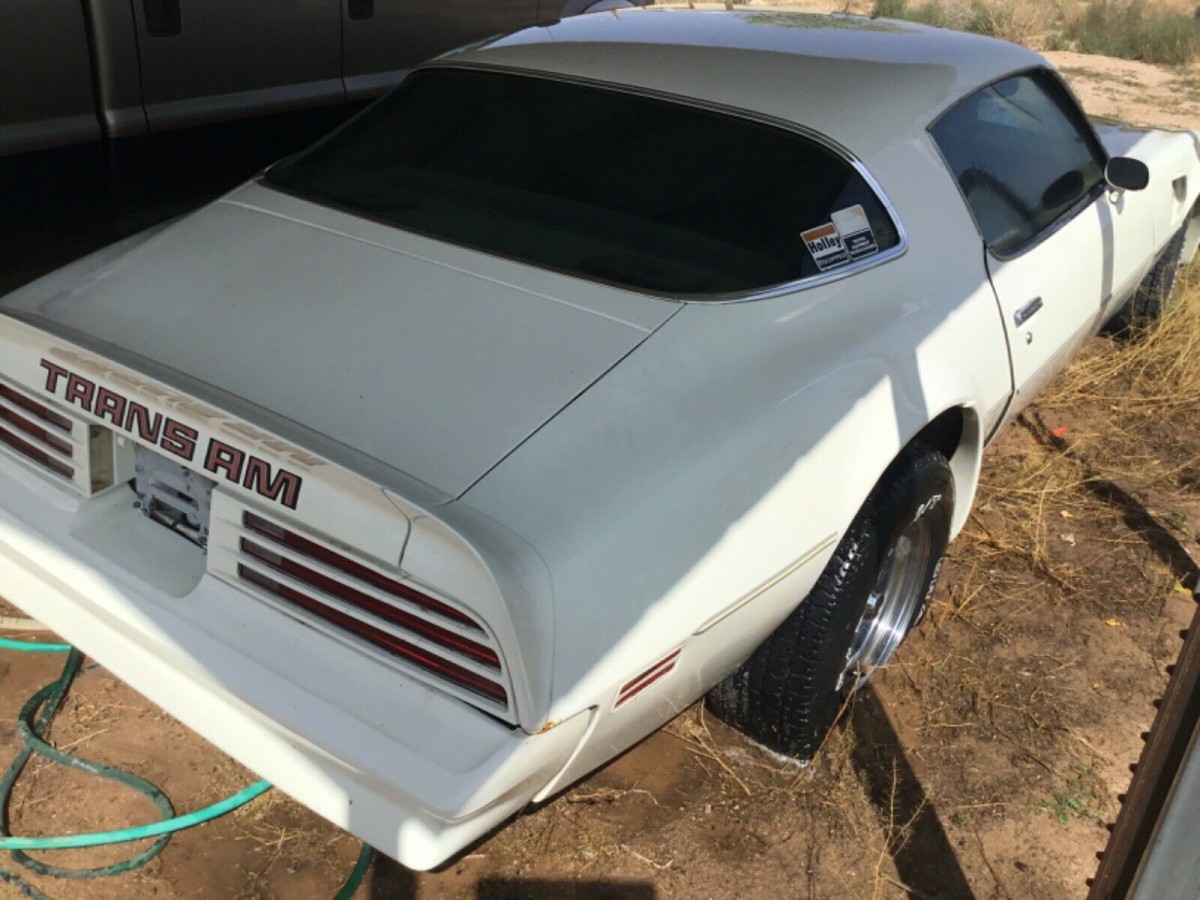 The rear passenger tire appears to be flat or sunken into the ground. The seller states that all four tires are dry rotted and will need to be replaced. Painted in white with a black interior, the car is said to be a 4 speed car with a modified 400 cubic inch V8 engine. The hood scoop reflects a later year T/A 6.6 call out instead of the correct “400” decal. The windows have dark tint and the car appears to be unlicensed.